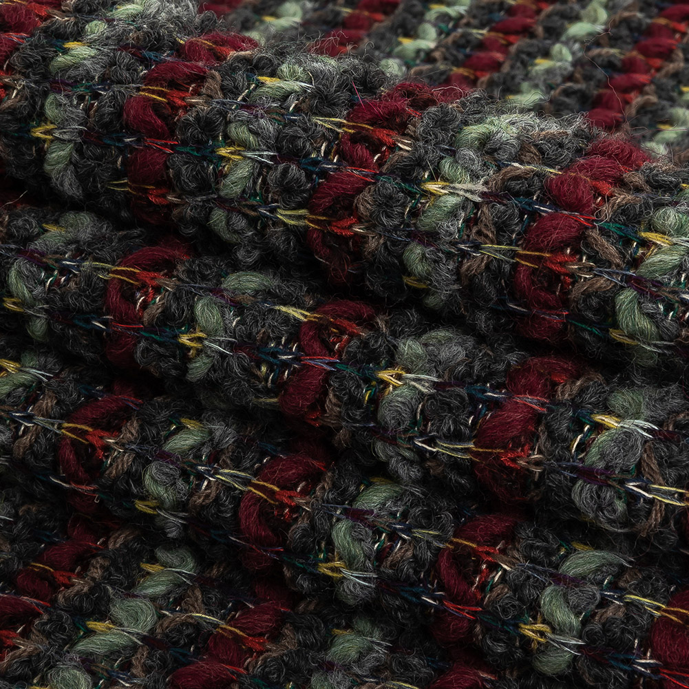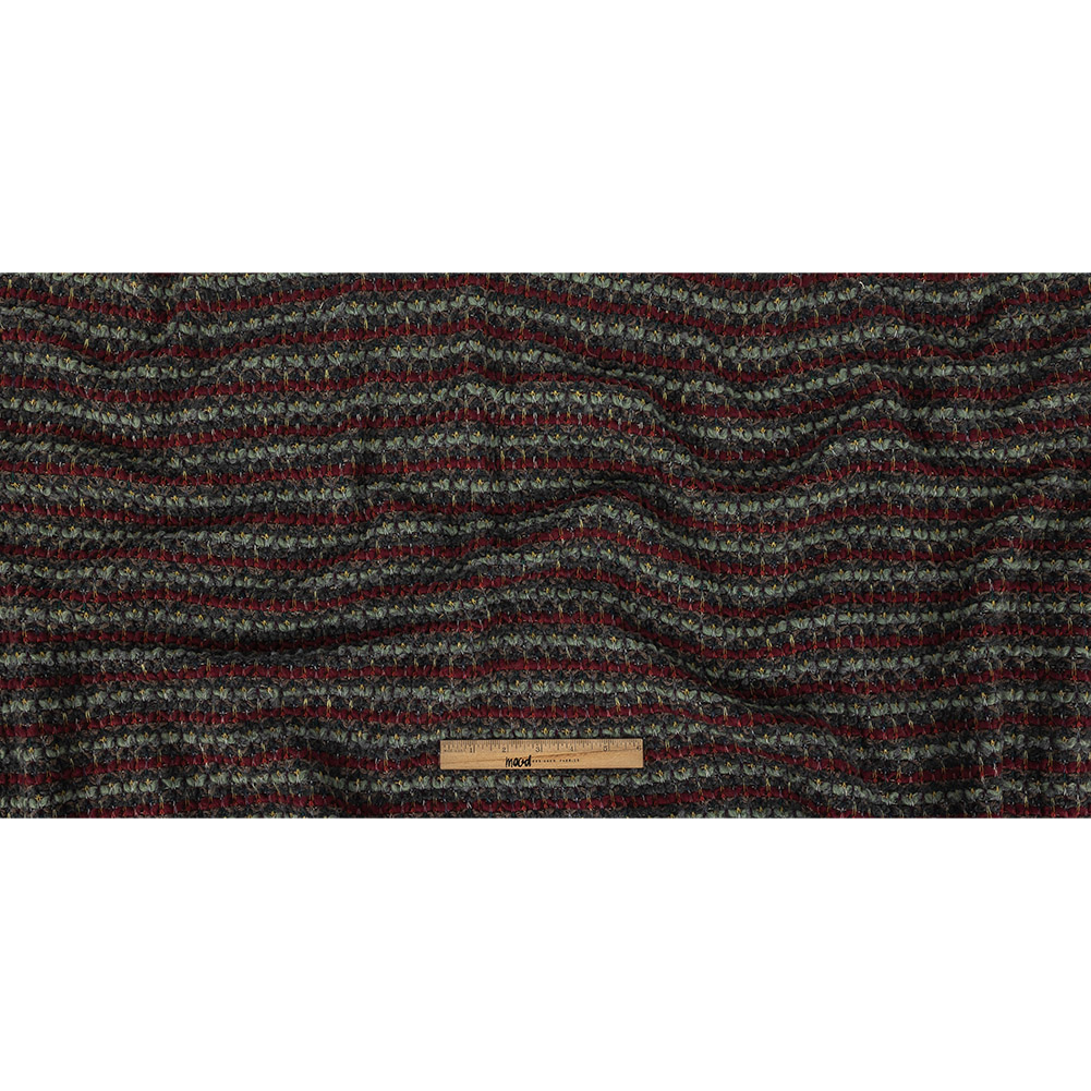 Darkly enchanting, this Italian Burgundy, Raven and Brunette Striped Chunky Wool Knit is ideal for the darkest of winter nights. Loosely spun wine red and green-tinged gray yarns run the width of this fabric, alternating with stripes of brown and charcoal boucle yarn and accented by golden yellow stitches; the reverse shows off similar colors in a flatter stockinette knit. With a comfortable weftwise stretch and a malleable drape, create oversized winter accessories like scarves and beanies, zip-up or button-down cardigans, and slouchy sweaters. Mostly opaque but with a slightly open construction, consider layering this material for additional warmth and comfort in wear.
