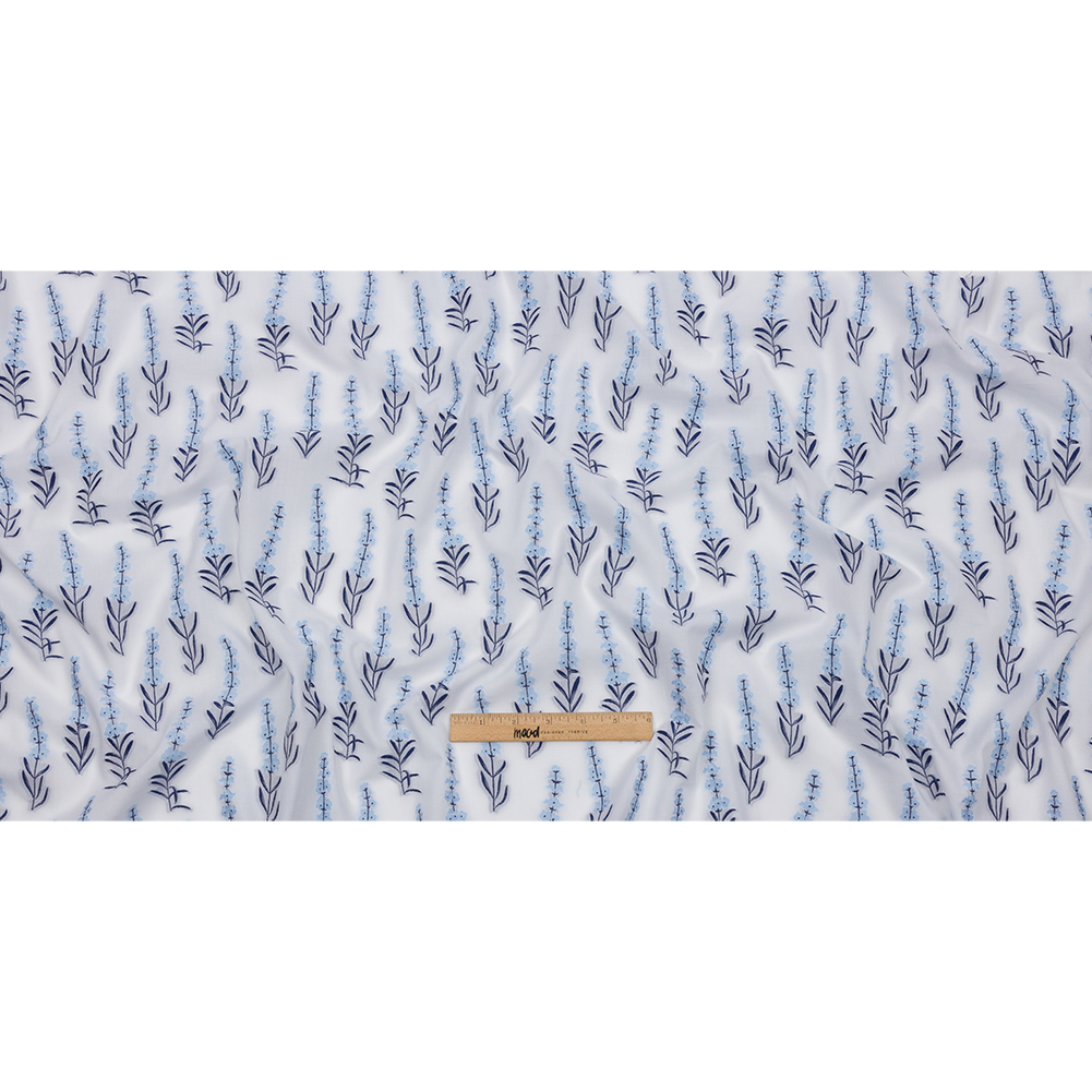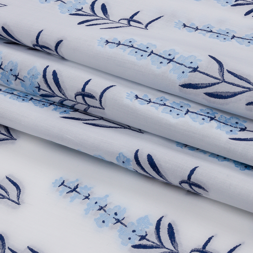Take this Italian Classic Blue and White Floral Cotton Jacquard on vacation with you. Baby blue flowers on darker blue stems run the length of this white fabric in a delicate array. Created with a Jacquard weave, the face features a faint texture, while the reverse is fuzzy where excess threads have been cut away. Airy and malleable in drape with no stretch, create ruffled sundresses, peasant blouses, tiered skirts, and shirts. Translucent, a lining may be added for full opacity where desired.