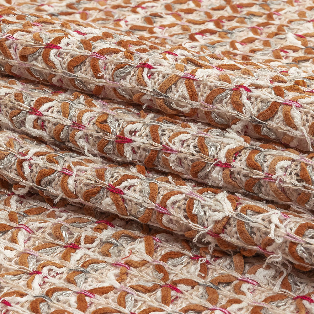 For free-spirited fashion, there’s no better choice than our eclectic Italian Ivory, Camel and Pink Tactile Cotton and Polyester Sweater Knit! Braided tan cords lay next to lustrous silver fibers accented by pink threads.