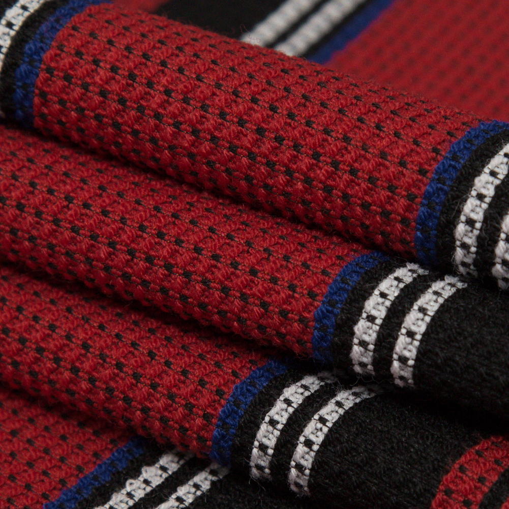 Vibrant shades collide to create Mood's Italian Mazarine Blue, Antarctica and Aurora Red Striped Stretch Polyester Woven. Crepe-like in hand, its intensely textured construction features little ridges that shine with a light luster. Cozy and featuring a 20% stretch through the weft, fashion mock-neck sweaters, fit-and-flare dresses, and tailored skirts using its weighted and flexible drape. Mostly opaque, a lining is not of necessity. Please note, this fabric weighs 348 GSM.