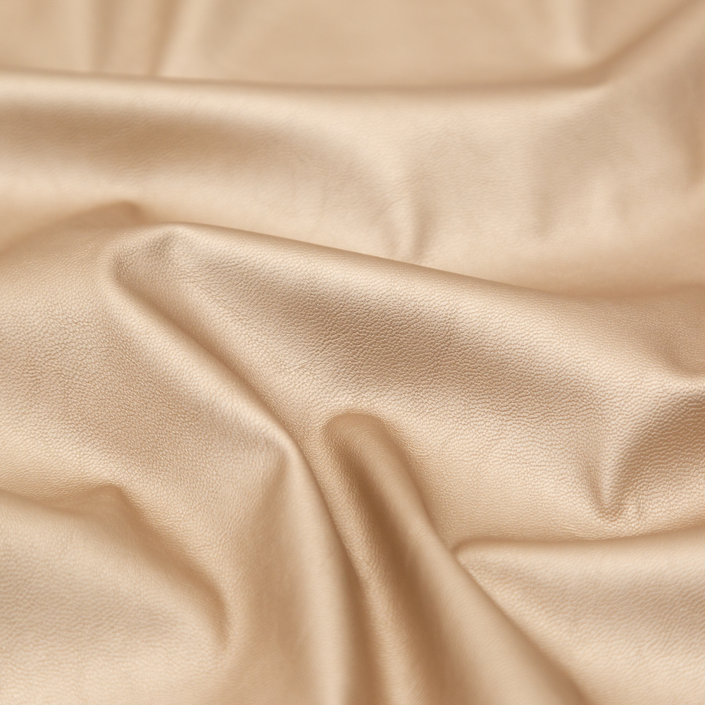 Counting down to a celebration? Toast your accomplishments and events with our Italian Metallic Champagne Faux Leather Laminate over a Latte Stretch Faux Suede. On the heavier side of medium weight, the luminescent, pebbled surface, with natural-looking variations, mimics the luxurious look of leather without the cost! Suitable for everyday fashion and semi-casual or formal events, put together pieces like draped, zip-up jackets with cowl necklines, short and bouncy A-line skirts, and others, or use it as an additive medium by juxtaposing it with other textiles. Maybe even introduce it to your home decor as throw pillows, window benches, and more. Opaque with a soft, brushed backing, lining this material is not of necessity. WARNING: Cancer and Reproductive Harm - www.P65Warnings.ca.gov.