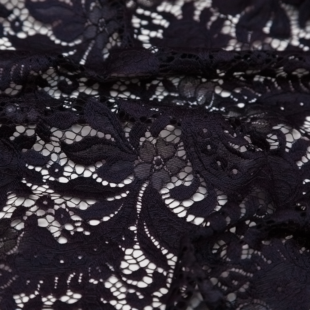 Scroll on over to high-fashion designs, courtesy of our Italian Mulberry Floral Lace with Scalloped Eyelash Edges. Flaunting two scalloped edges, batting your eyelashes equates to countless designs with exquisite necklines and hems. Carrying a textured hand and an effortless drape, stun the masses in visually appealing dresses, skirts, and blouses of all lengths. Royal purple embroidery thread builds a raised textural experience on a darker purple ground while issuing “peek-a-boo” moments, all-in-all boasting everlasting charm. On the lighter side of medium weight, play with opacity by selectively incorporating a lining fabric. Complete your look with an