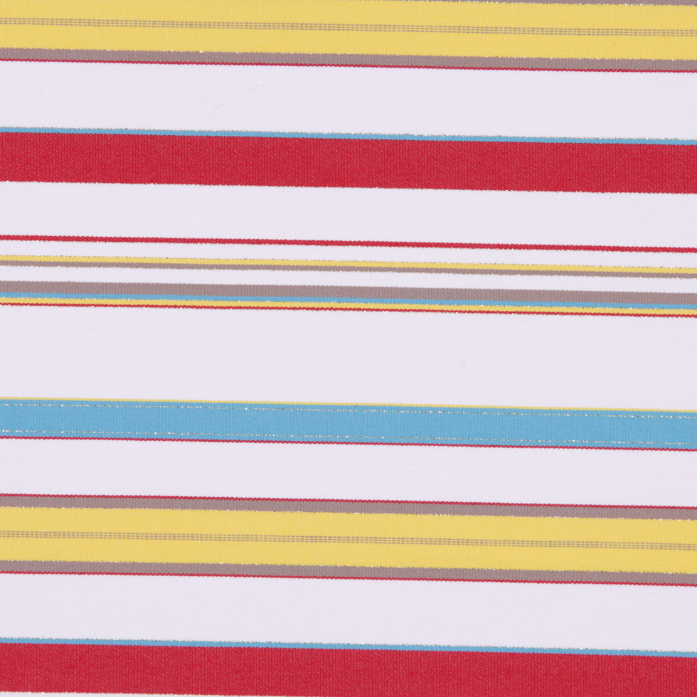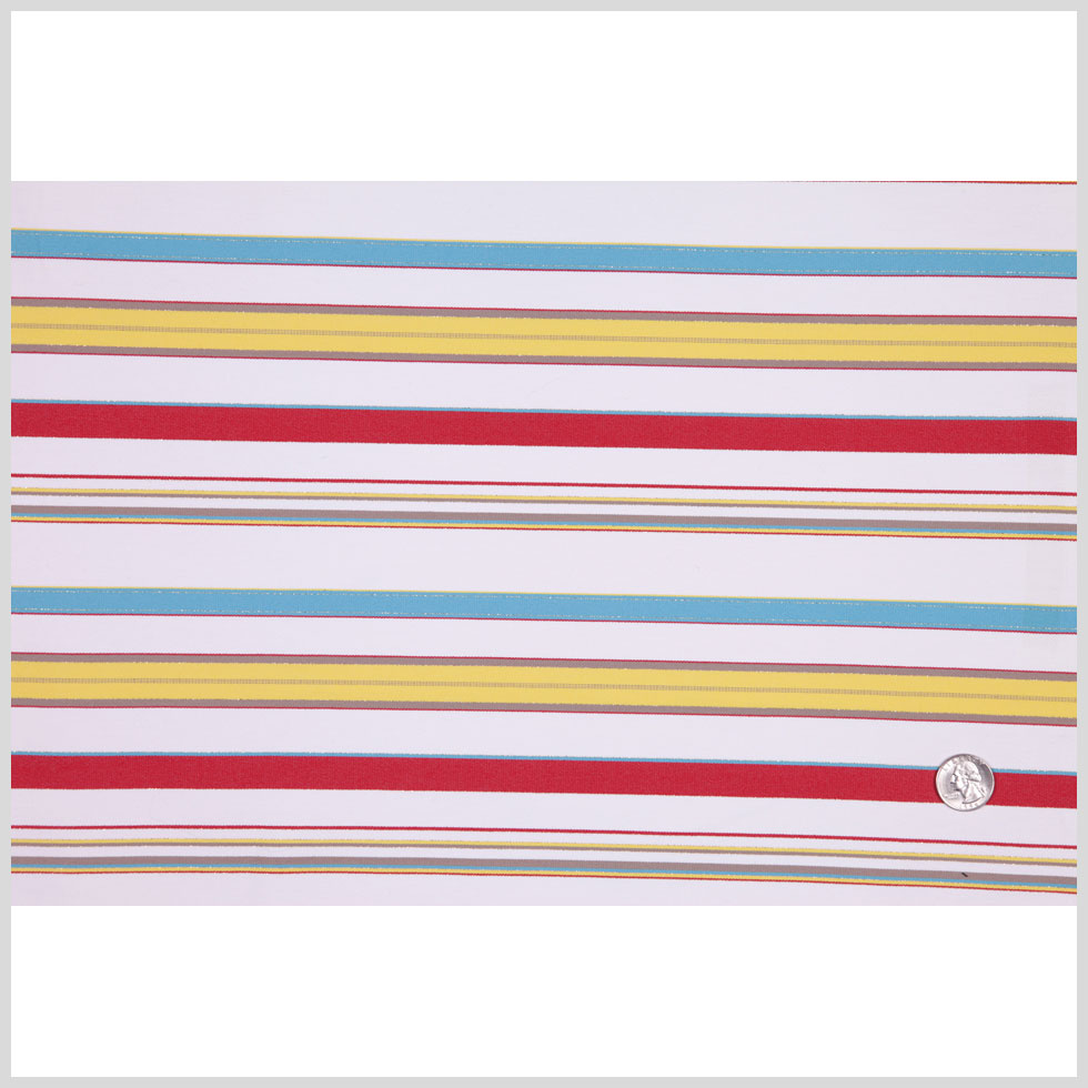 Set sail in your new Italian Multicolor Barcode Striped Stretch Twill capris! This dynamic fabric is rather soft and highlighted by thin stripes of gold metallic for extra flare. A nice stretch along the weft allows for the production of tailored and fitted garments. Although it is a medium weight fabric, white is a dominate color, so some areas are a bit translucent. Whether worn as fit and flare pants for a 70's revival look, or simply as a striking shirt, this fabric is sure to turn heads.