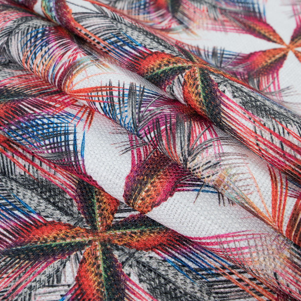 Get inspired by that island getaway you've been dreaming of and create your next favorite piece wih this Italian Rainbow Tropical Digitally Printed Canvas. A soft, textured Italian woven with a similar hand to a tweed boasts a pattern that may only be described as a kaleidoscopic view of palm leaves. Mesmerizing and of a medium weight, it is ideal for late-night jackets, shift dresses or a crop top/skirt combos. Showcasing a stiffer drape, tailored silhouettes are best suited for this woven. A lining may be desired, as this thin canvas is translucent through its weave. Take a look through the collection to find the best color palette for your look! Note that this fabric may be machine washed in waters no higher than 40 degrees Celsius. Do not bleach or tumble dry this fabric. It may be ironed in temperatures no higher than 230 degrees Fahrenheit. You can use any solvent for dry cleaning except tetrachloroethylene.