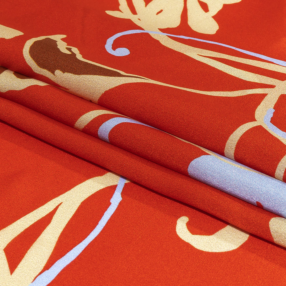 Italian Red, Beige and Sky Ornamental Floral Silk Charmeuse