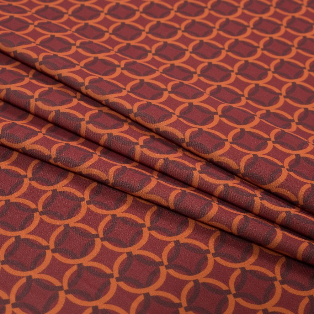 With colors that remind us of a Moroccan desert, add this Italian Terracotta Geometric Stretch Polyester to your wardrobe. Digitally printed interlocking circles create a chainmail pattern that references a 1960's mod look. An impeccably smooth Italian hand combines with a fluid silk-like drape to create softer silhouettes that are runway ready. We see this poly inspiring vintage-styled mini dresses, wrap dresses, tops and tunics. Additional to boasting on-trend looks, this woven is sure to keep you comfortable with its 4-way stretch. Thin and lightweight, a lining may be desired as it is translucent.