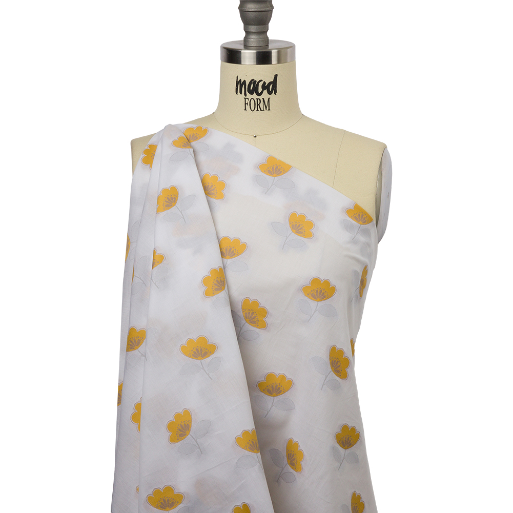 Sink into vintage styling with this White, Goldenrod, and Gray Floral Cotton Jacquard. Simple yellow and taupe flowers on pale gray stems dance across a white background. Created with a Jacquard weave, the face features a faint texture, while the reverse is fuzzy where excess threads have been cut away. Airy and malleable in drape with no stretch, create ruffled sundresses, peasant blouses, tiered skirts, and shirts. Translucent, a lining may be added for full opacity where desired.