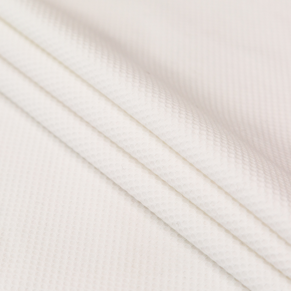 Show off the curves of your body with our Italian Stretch Bullseye Pique in White. Let the stiff drape and crisp hand of this medium-weight fabric direct your designs toward silhouettes that benefit from a nice weft-wise stretch. Think of snow white as the color of this material and soft, webbed netting for its subtly textured surface. Take advantage of its versatility: Create matching polos and skirts, tennis dresses, athletic-style jackets, and more! While it's nearly opaque, a lining is suggested for additional modesty or comfort, as well as if applicable for your design.