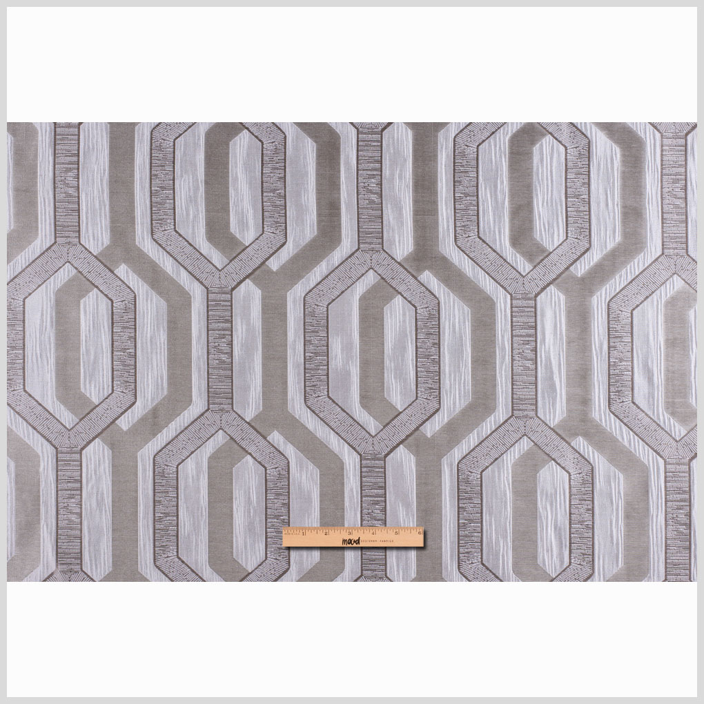 Texture variation is key on this fabulous medium-weight poly. Hexagons have either a subtle, ribbon-like feel or a horizontal texture that contrasts with the smooth woven background. A rich ivory, this fabric is best suited for light upholstery or drapery.