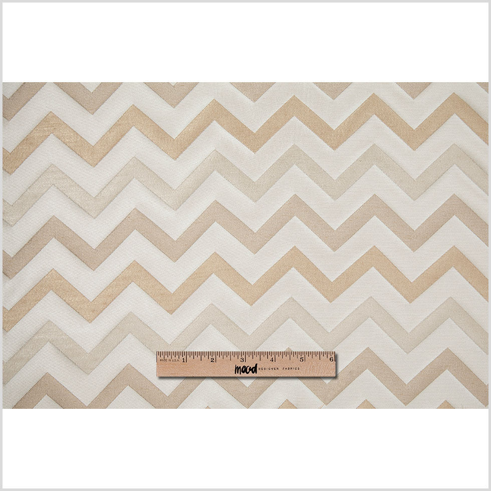 An elegant polyester home fabric featuring a bold chevron pattern of alternating light and darker colors.