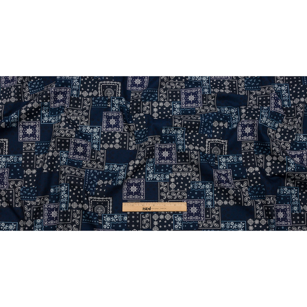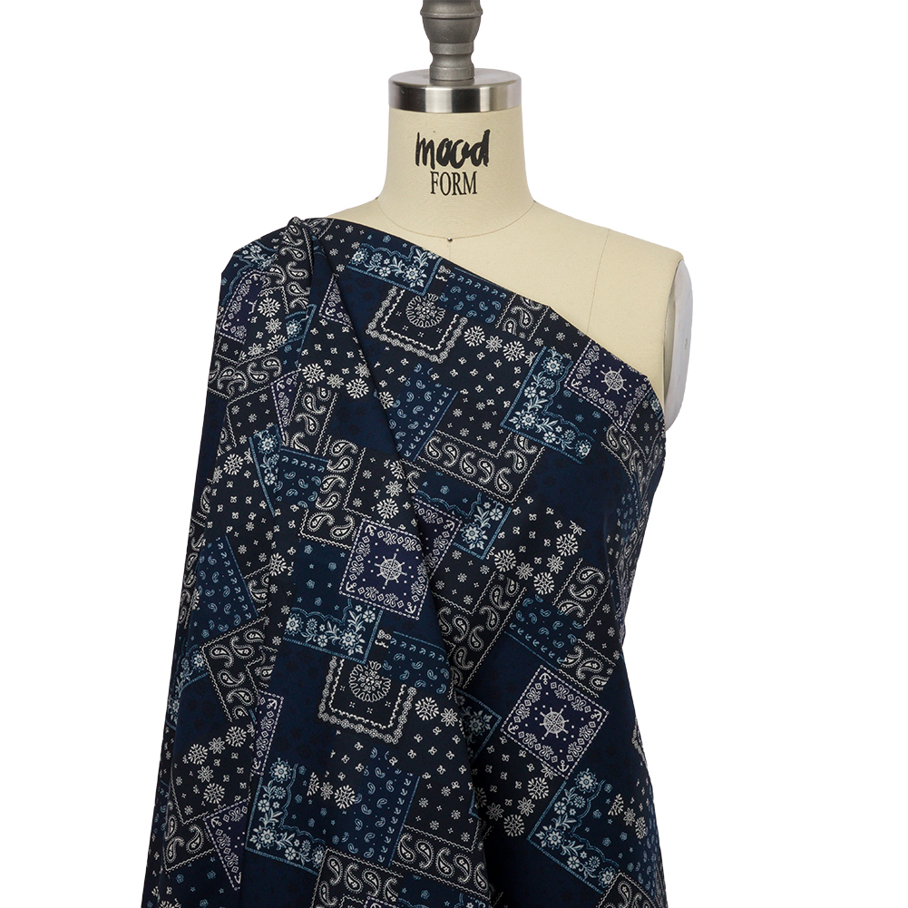 Classic summer looks are calling from this Japanese Navy and White Bandana Patchwork Cotton Woven. A smooth navy blue base hosts a myriad of white and light blue motifs—paisley, stars, florals, and more—in a patchwork, layered effect. With a crisp hand, malleable but slightly structured drape, and no stretch, craft button-up shirts, shirtdresses, blouses, and pleated skirts. Additionally, this fabric is ideal for quilting and craft applications like table runners, throw pillows, and, of course, quilts! Opaque, a lining is not necessary for most projects.