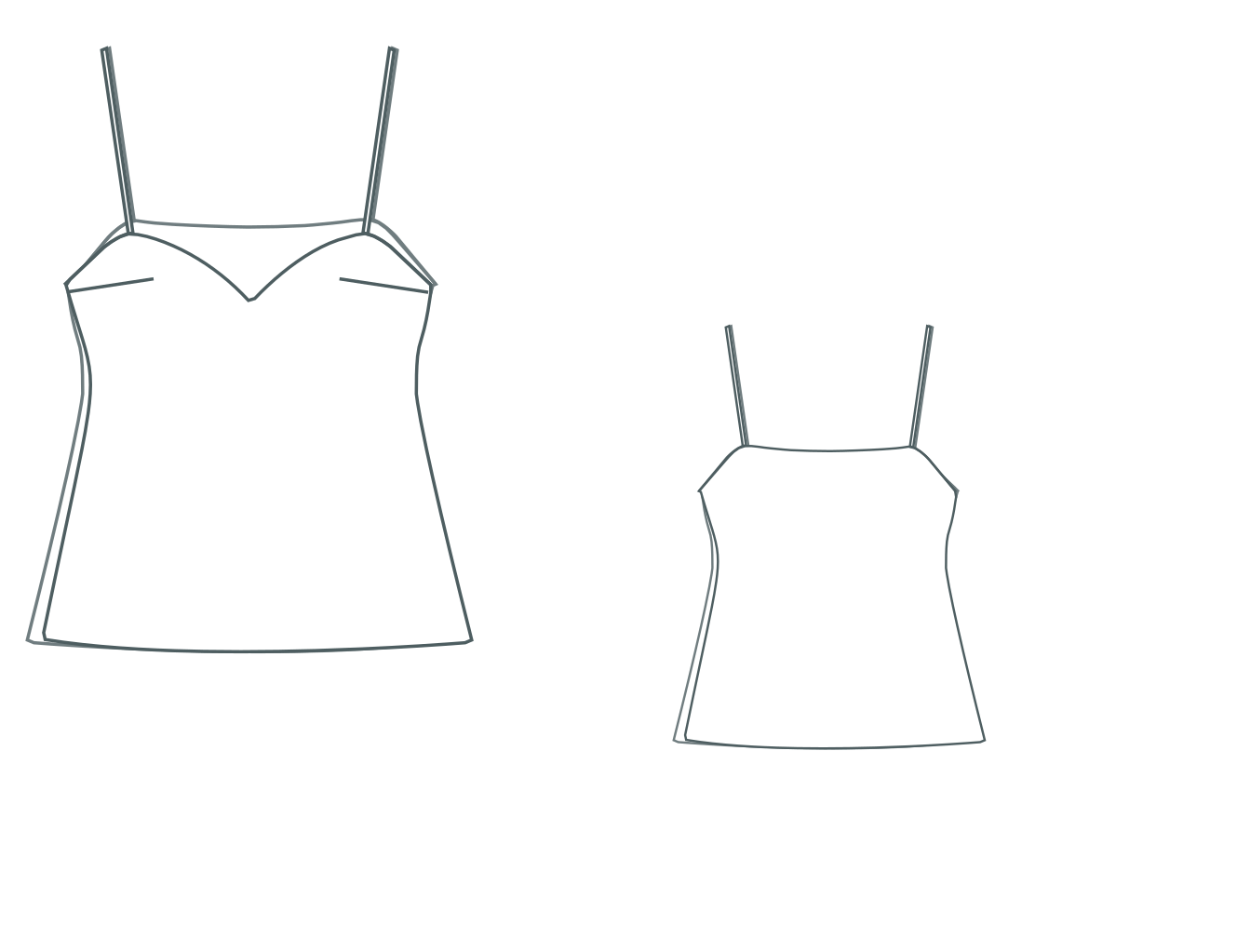 Woven, relaxed, above high hip top with bust darts, a sweetheart neck, straight neck bodice at the back, sleeveless.