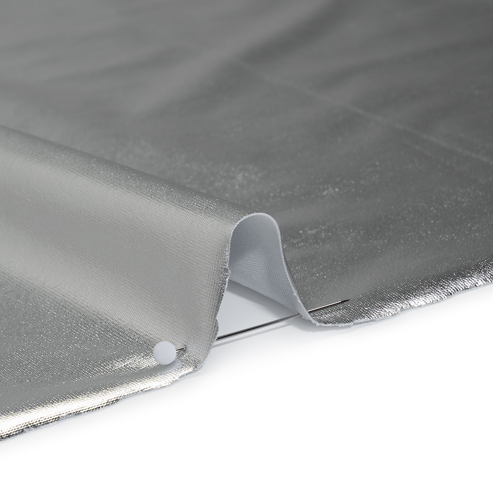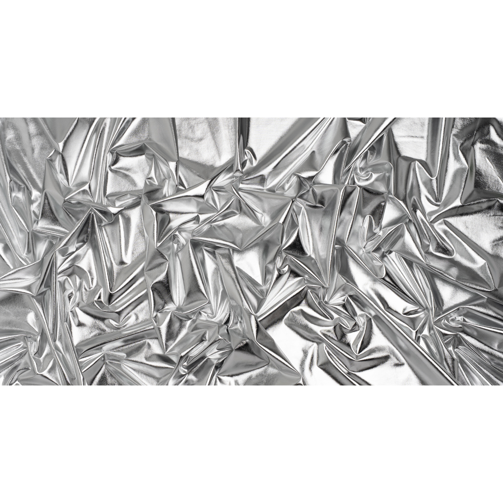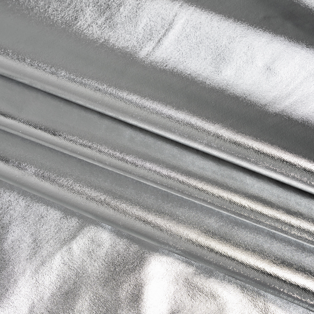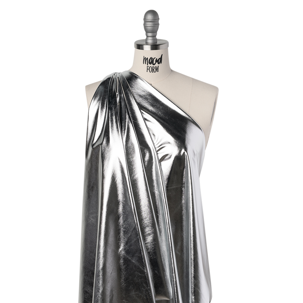 Craft some cosmic couture with this Silver Knit Faux Leather with PET Anodized Aluminum Film—featuring a slight all-way stretch, sleek hand, and flexible drape.Suggested Projects: Jackets, Tops, Dresses, PantsContent: 95% Polyester, 5% SpandexStretch: 25% Weftwise, 15% WarpwiseOpacity: OpaquePlace performance and futuristic fashion at the forefront with this metallic silver knit faux leather. Blending the flexibility of knit-backed faux leather with the metallic sheen and durability of PET anodized aluminum, this fabric is ready to take your creations to new heights. From bodycon to flowing silhouettes, its sleek hand and flexible drape are ready to become oversized varsity jackets, body-hugging pants, and tiny tops—or go the accessory route with handbags, totes, and headcarves! Opaque but gaining translucency as it’s stretched, adding a lining enhances opacity and delivers a polished finish.
