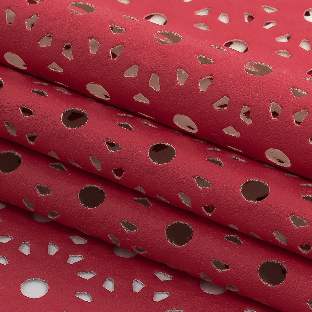 This Fuchsia Geometric Lasercut Stretch Faux Leather is a hole lot of fun! Bright pink in hue with a fine leathery grain on the face, this material features a cut-out pattern of circles and tiny triangles resembling flowers or suns, along with a simple white knit backing.
