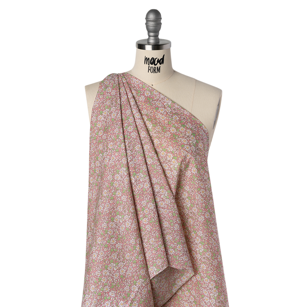 You’ll never be late when you can just throw on this Pink Alice W Tana Lawn® by Liberty Fabrics. With a smooth, silk-like hand and a fluid, billowing drape, it’s a luxurious choice for breezy, summer-ready silhouettes that float with every step.Suggested Projects: Blouses, Skirts, Dresses, QuiltsContent: 100% CottonStretch: NoneOpacity: Slightly TranslucentInspired by Alice’s Adventures in Wonderland, this whimsical design features cheerful daisies blooming in green and white across a soft baby pink backdrop. Look closely, and you’ll find tiny playing card suits hidden among the petals—like secret nods to a curiouser and curiouser world. Indulge in the silk-like softness of this mesmerizing Tana Lawn® cotton, the result of a century-long evolution in fabric perfection. Crafted with precision at the Liberty Printing Mill, it showcases unparalleled print clarity and color saturation, designed to captivate from the first glance. Breathable, with a fluid, billowing drape, it’s perfect for crafting button-up camp shirts, fluttering blouses, empire-waist dresses, and ethereal wide-leg pants—or let its vibrant hues elevate quiltwork with a charm that enchants at every angle. Slightly translucent, we suggest adding a lining where opacity is desired.