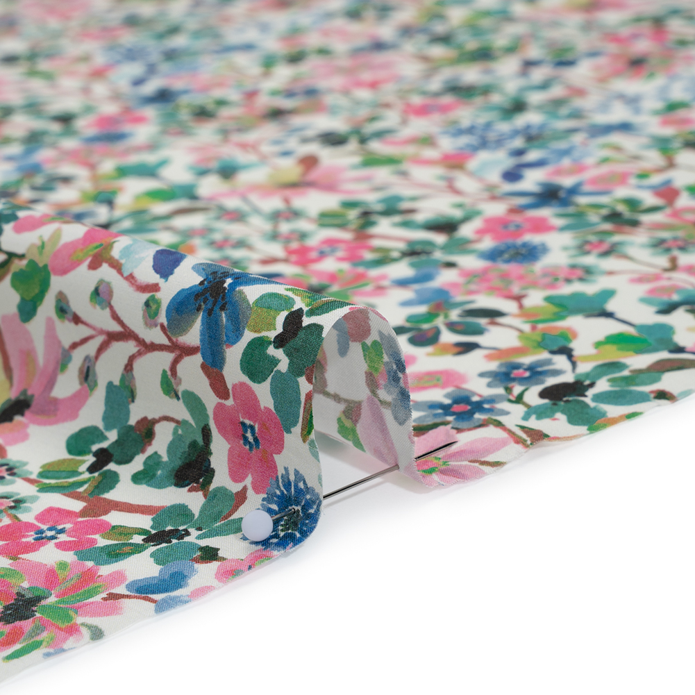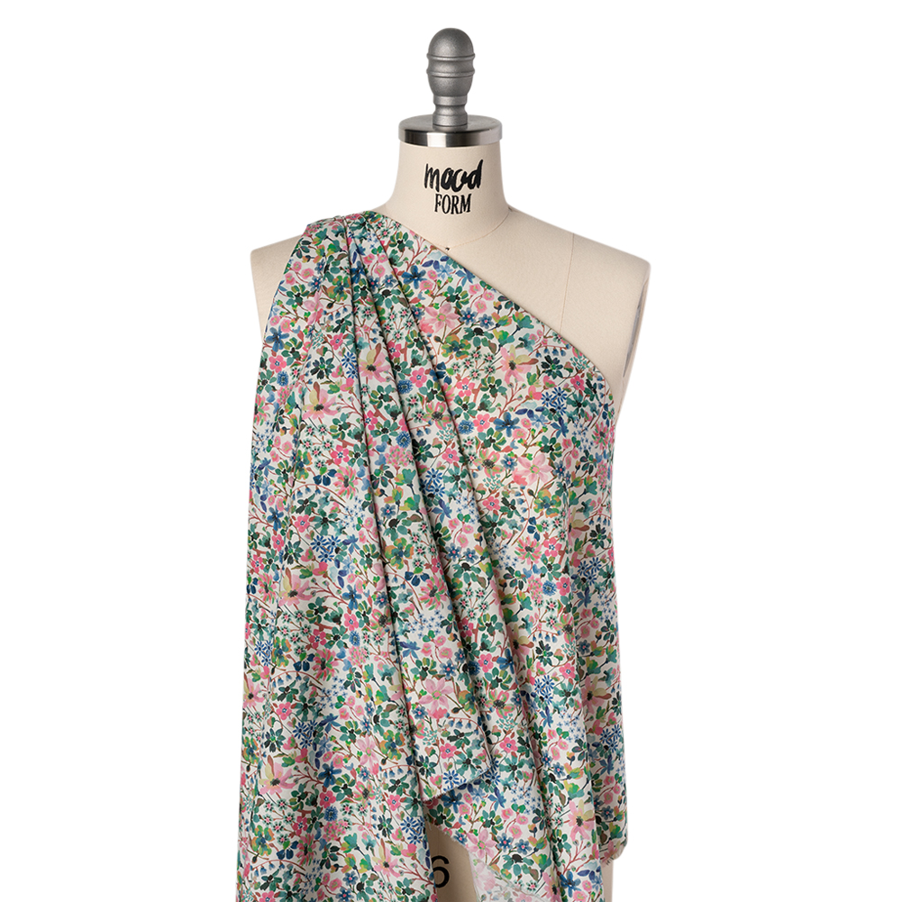 Let the rain fall on your face and coax this Green Dreams of Summer Tana Lawn® by Liberty Fabrics to grow. With a smooth, silk-like hand and a fluid, billowing drape, it’s a luxurious choice for breezy, summer-ready silhouettes that float with every step.Suggested Projects: Blouses, Skirts, Dresses, QuiltsContent: 100% CottonStretch: NoneOpacity: Slightly TranslucentOriginally painted in oils with an Impressionistic touch, daisies, primroses, cornflowers, daffodils, and forget-me-nots layer and bloom in vivid hues of pink, green, blue, and brown—each brushstroke inviting you to dream of summer. Indulge in the silk-like softness of this mesmerizing Tana Lawn® cotton, the result of a century-long evolution in fabric perfection. Crafted with precision at the Liberty Printing Mill, it showcases unparalleled print clarity and color saturation, designed to captivate from the first glance. Breathable, with a fluid, billowing drape, it’s perfect for crafting button-up camp shirts, fluttering blouses, empire-waist dresses, and ethereal wide-leg pants—or let its vibrant hues elevate quiltwork with a charm that enchants at every angle. Slightly translucent, we suggest adding a lining where opacity is desired.