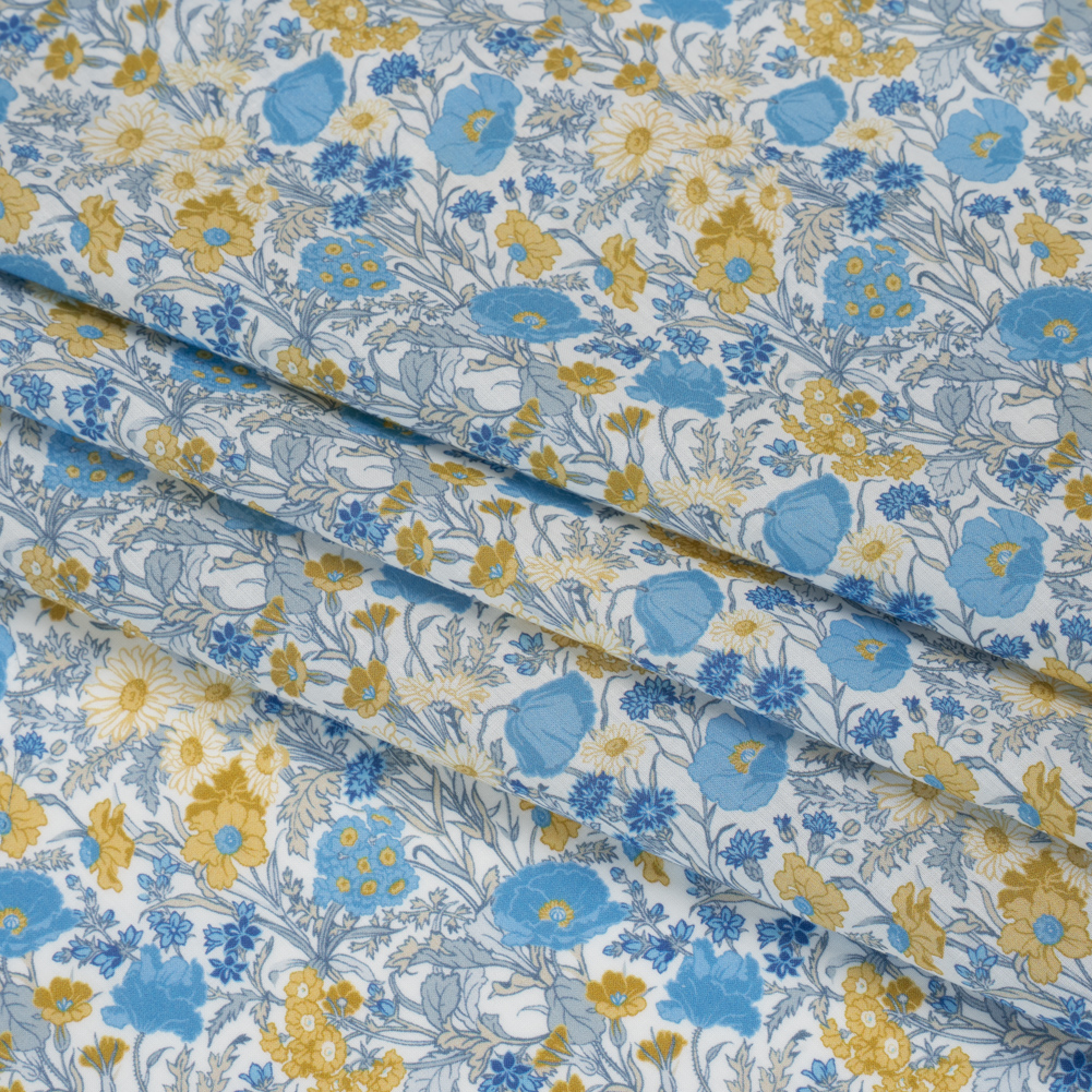 A gentle breeze winds its way through this Blue Florence May Tana Lawn® by Liberty Fabrics. With a smooth, silk-like hand and a fluid, billowing drape, it’s a luxurious choice for breezy, summer-ready silhouettes that float with every step.Suggested Projects: Blouses, Skirts, Dresses, QuiltsContent: 100% CottonStretch: NoneOpacity: Slightly TranslucentWildflowers native to the English countryside bloom in joyful abundance across a white backdrop. Poppies, daisies, daffodils, primroses, cornflowers, and forget-me-nots guide you through a windswept spring meadow, their pastel yellow and blue hues dancing in the breeze and inviting you to enjoy every moment outside. Indulge in the silk-like softness of this mesmerizing Tana Lawn® cotton, the result of a century-long evolution in fabric perfection. Crafted with precision at the Liberty Printing Mill, it showcases unparalleled print clarity and color saturation, designed to captivate from the first glance. Breathable, with a fluid, billowing drape, it’s perfect for crafting button-up camp shirts, fluttering blouses, empire-waist dresses, and ethereal wide-leg pants—or let its vibrant hues elevate quiltwork with a charm that enchants at every angle. Slightly translucent, we suggest adding a lining where opacity is desired.