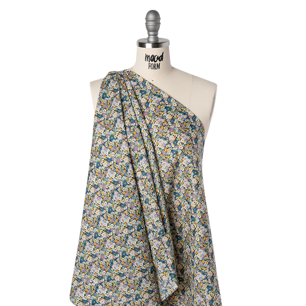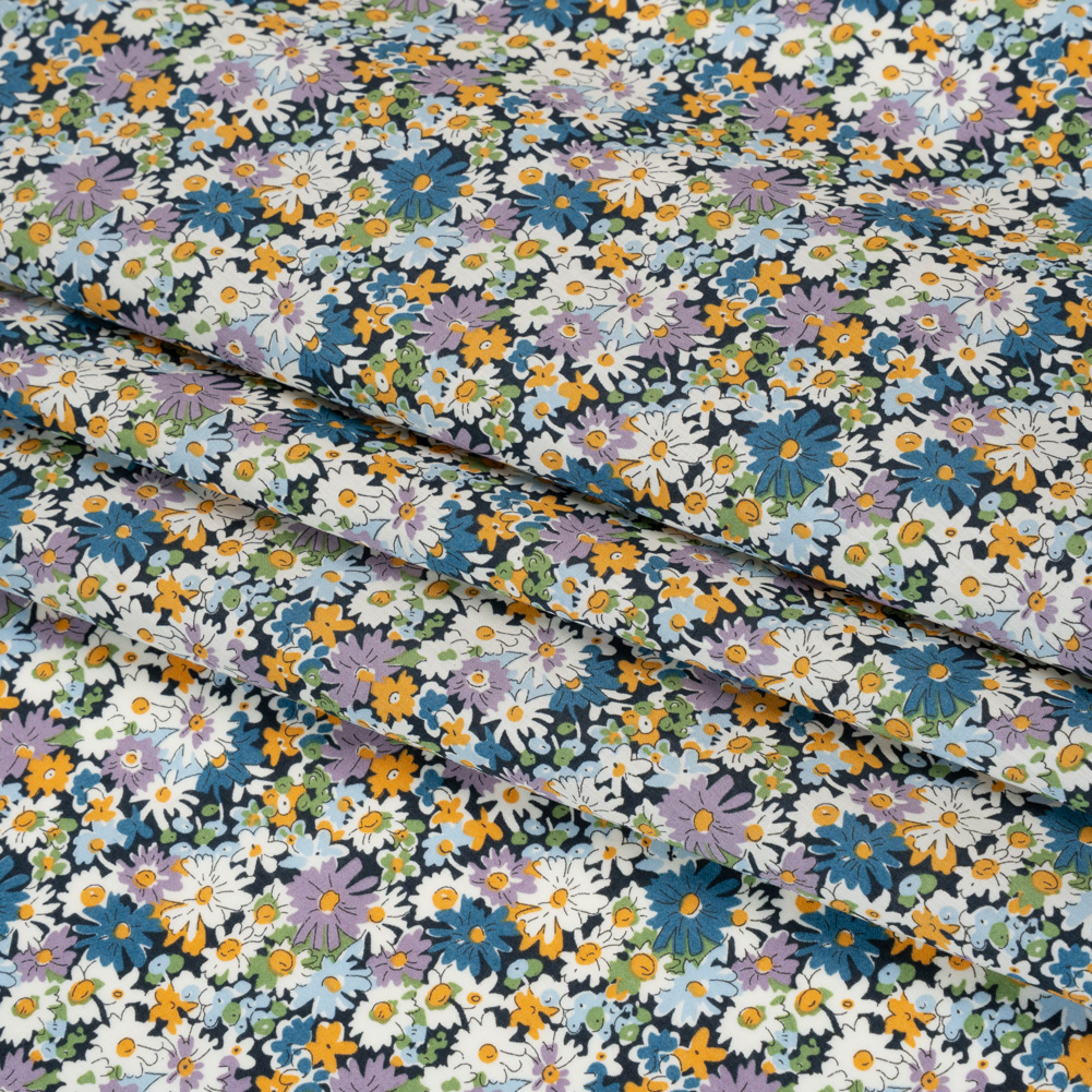 This Purple Libby Tana Lawn® by Liberty Fabrics is a sketchbook of spring brought to life under a twilight sky. With a smooth, silk-like hand and a fluid, billowing drape, it’s a luxurious choice for breezy, summer-ready silhouettes that float with every step.Suggested Projects: Blouses, Skirts, Dresses, QuiltsContent: 100% CottonStretch: NoneOpacity: Slightly TranslucentWhimsical daisy doodles bloom and overlap across a deep navy backdrop, their playful petals unfurling in hues of lavender, blue, yellow, and green. Indulge in the silk-like softness of this mesmerizing Tana Lawn® cotton, the result of a century-long evolution in fabric perfection. Crafted with precision at the Liberty Printing Mill, it showcases unparalleled print clarity and color saturation, designed to captivate from the first glance. Breathable, with a fluid, billowing drape, it’s perfect for crafting button-up camp shirts, fluttering blouses, empire-waist dresses, and ethereal wide-leg pants—or let its vibrant hues elevate quiltwork with a charm that enchants at every angle. Slightly translucent, we suggest adding a lining where opacity is desired.