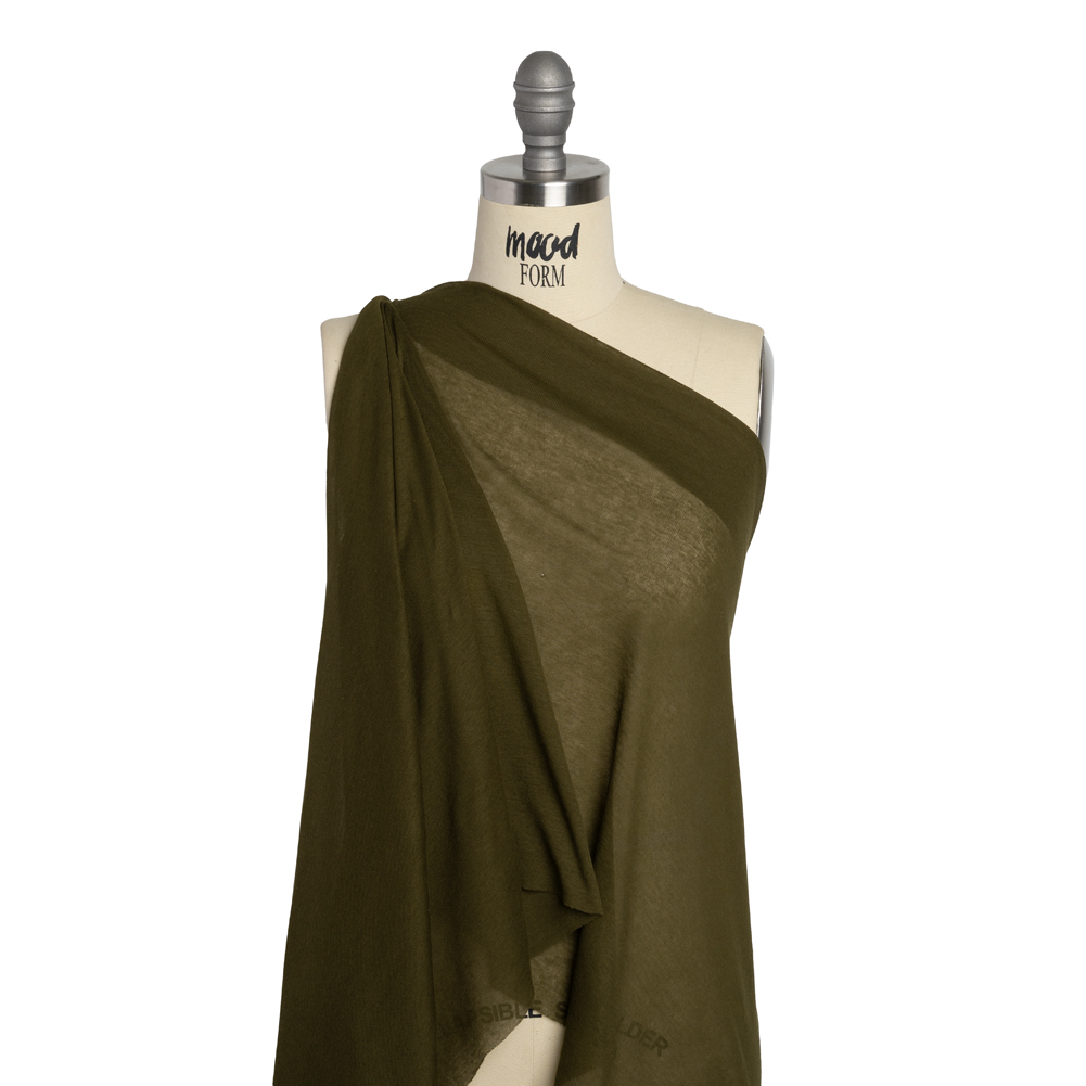 Spend days reconnecting with nature with this Army Green Lightweight Cotton Interlock Knit, featuring a soft hand, extremely generous stretch, and airy, flexible drape.Suggested Projects: Shirts, Dresses, Shorts, Lightweight PajamasContent: CottonStretch: 100% WeftwiseOpacity: TranslucentThis army green cotton knit is truly down to earth. Exceptionally lightweight, this knit features a super-soft hand and an airy, flexible drape. With a 100% stretch through the weft, create billowing dresses with gathered skirts, comfy summer pajama sets, and wide-legged jumpsuits. Translucent, self-lining or layering is recommended for opacity where desired.