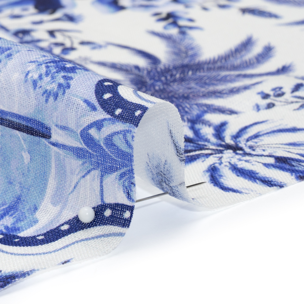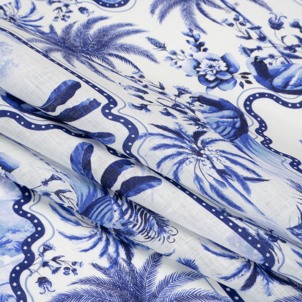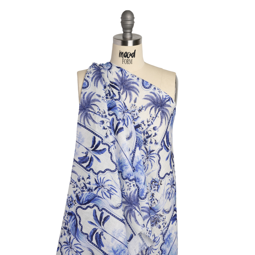 Visions of a tropical vacation unfurl before you with this Palms in Paradise Linen Woven. Light in weight, it features a slightly slubbed hand and fluid drape.Suggested Projects: Shirts, Skirts, Pants, DressesContent: 100% LinenStretch: NoneOpacity: TranslucentAbstract frames let the onlooker peek into a tropical paradise, surrounded by palm trees, flowers, and parrots in a brilliant blue and white contrast. Complementing the easy-going feel of linen, this is a warm-weather fabric that will become a summer staple, workplace go-to, and everything in between. The face is slightly slubbed and the drape is fluid. Naturally moisture-wicking and of a light weight, this linen will make steamy summer days a breeze. Create relaxed button-downs, maxi-shirred skirts, fit-and-flare dresses, and more! As it is translucent, a lining may be desired depending on the project.