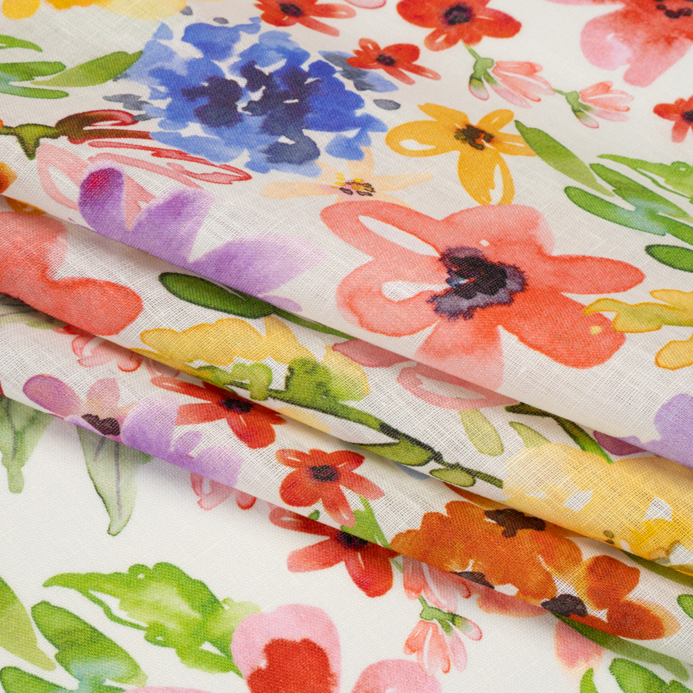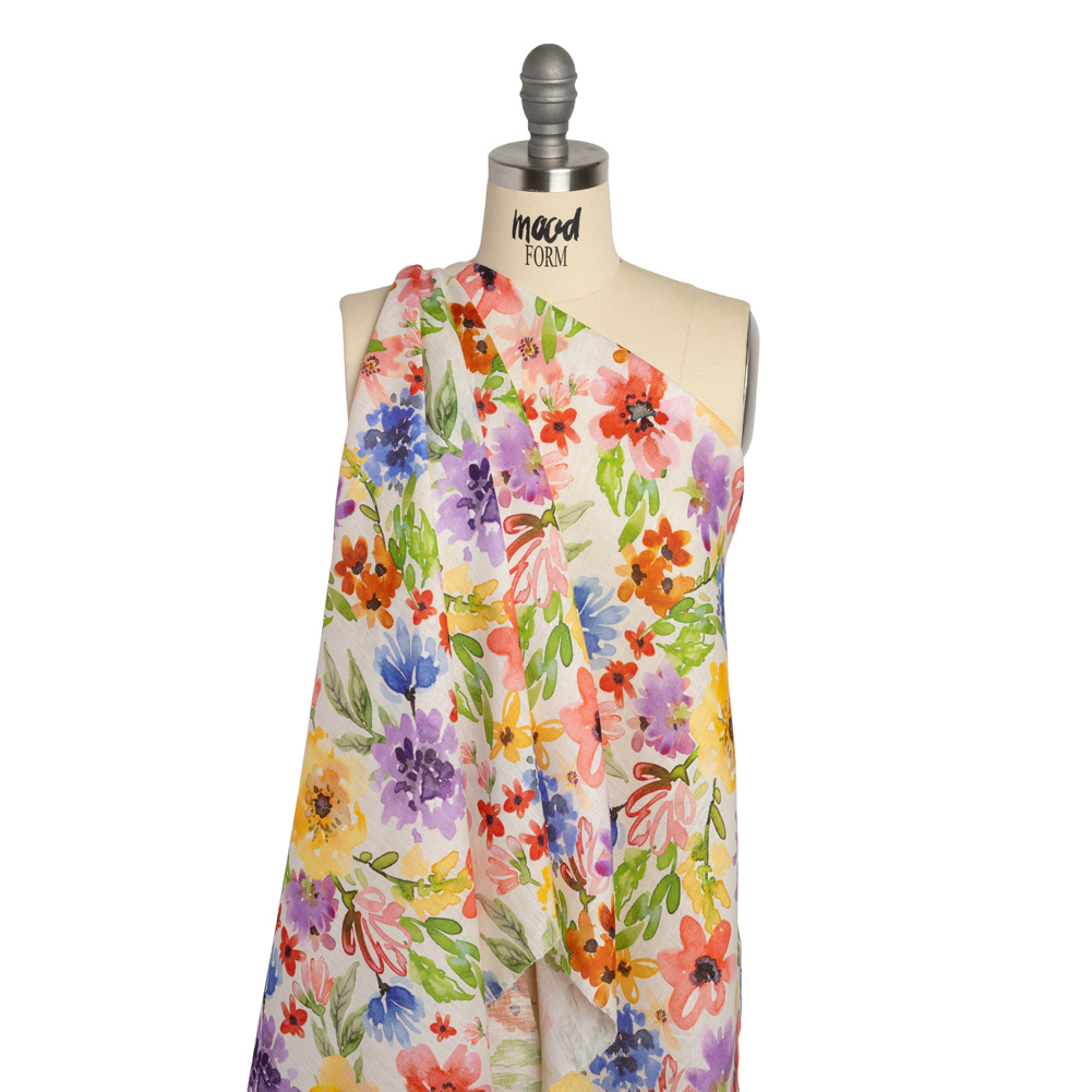Flowers drift through the air on this Petal Drift Florals on White Linen Woven. Light in weight, it features a slightly slubbed hand and fluid drape.Suggested Projects: Shirts, Skirts, Pants, DressesContent: 100% LinenStretch: NoneOpacity: TranslucentA rainbow of flowers and petals drift across a white background, complementing the easy-going feel of linen, a warm-weather fabric that will become a summer staple, workplace go-to, and everything in between. The face is slightly slubbed and the drape is fluid. Naturally moisture-wicking and of a light weight, this linen will make steamy summer days a breeze. Create relaxed button-downs, maxi-shirred skirts, fit-and-flare dresses, and more! As it is translucent, a lining may be desired depending on the project.