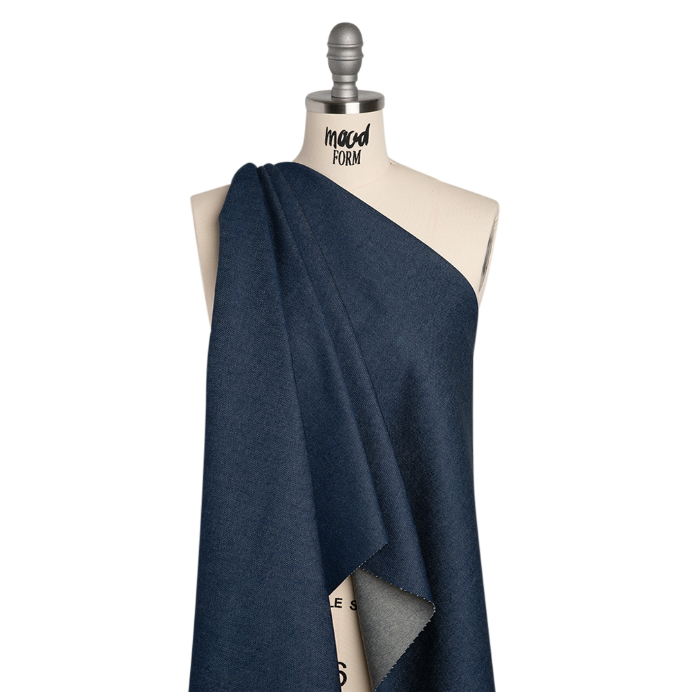 Make this Light Indigo and Cream Lightweight Rigid Cotton Denim Twill your next spring sewing selection—featuring a tactile hand and structured drape.
