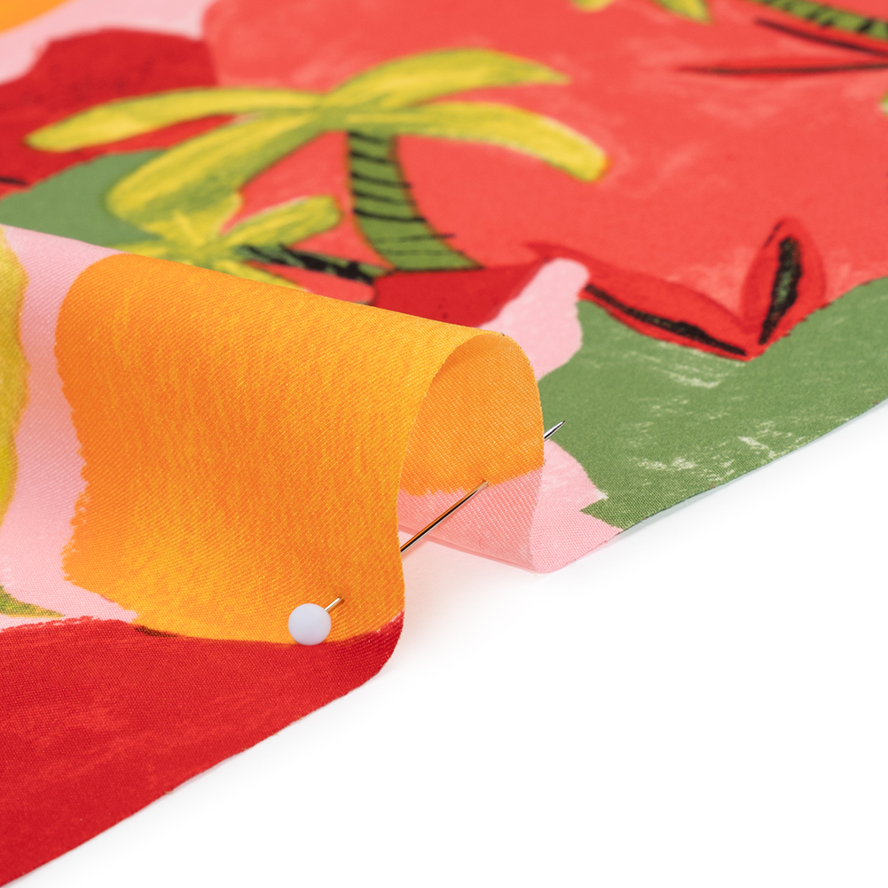Don’t forget your sunblock before stepping out in this Palm Trees and Cactuses Lightweight Stretch Polyester Twill Print—featuring a sleek, smooth hand and fluid drape.Suggested Projects: Dresses, Skirts, Blouses, ShirtsContent: 100% PolyesterStretch: 10% WeftwiseOpacity: Mostly OpaqueA tropical paradise unfolds across this twill, where palm trees, cacti, and suns beckon you into a sun-soaked escape in hues of coral red, orange, green, and pink. Lightweight with a sleek, smooth hand and a slight stretch through the weft, it drapes fluidly for warm-weather wear that moves with you. Whether crafted into breezy blouses, twirling wrap dresses, or used as a bold lining, this fabric brings the heat while keeping you cool. Mostly opaque, a lining can be added for opacity but is not necessary for most projects.