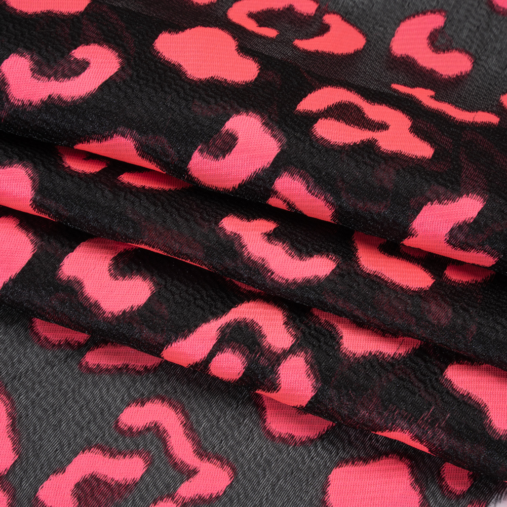 This Bright Pink and Black Animal Spots Lightweight Textured Burnout Brocade is a tropical temptation—featuring a soft, tactile hand and fluid, airy drape.Suggested Projects: Blouses, Skirts, Dresses, OverlaysContent: 100% PolyesterStretch: NoneOpacity: SheerBright pink animal spots stand out against a sheer black background, the weave retaining a soft, slightly tactile hand that’s equally luxurious as an overlay or a sheer, stand-alone piece. With a fluid, airy drape, we envision breezy blouses, enticing wrap skirts, and bathing suit cover-ups, or take this fabric out on the town and use it as an overlay for evening gowns, jackets, and billowing skirts. Sheer, we recommend using a lining or layering over camis or slips.