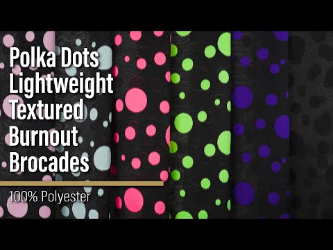 Dance the polka in this Purple and Black Polka Dots Lightweight Textured Burnout Brocade— featuring a soft, tactile hand and fluid, airy drape.Suggested Projects: Blouses, Skirts, Dresses, OverlaysContent: 100% PolyesterStretch: NoneOpacity: SheerPurple polka dots in various sizes bounce against a sheer black background, the weave retaining a soft, slightly tactile hand that’s equally luxurious as an overlay or a sheer, stand-alone piece. With a fluid, airy drape, we envision breezy blouses, enticing wrap skirts, and bathing suit cover-ups, or take this fabric out on the town and use it as an overlay for evening gowns, jackets, and billowing skirts. Sheer, we recommend using a lining or layering over camis or slips.