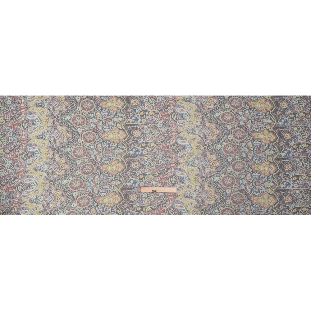 Feel enraptured by this exciting Lime, Blue and Black Floral Silk Chiffon. An overflow of archways, floral motifs, and medallions, decorated with flowers, leaves, and dots, crowd a black lawn in an orderly chaos. Your eye is immediately drawn in by this ornate design, colored in navy, light blue, and light green hues that ease into the darker black and brown colors.Romanticize any silhouette with silk chiffon’s sheer quality and airy drape. A grainy hand accompanies this ethereal fabric, inspiring floor-length gowns, dusters, blouses with ruffled sleeves, scarves, and more. A tip from our sewists: do not feel intimidated by sewing this delicate fabric; using a rotary cutter (or sharp scissors and sharp pins), fine needles, tight stitching, French seams, and patience, anyone can show up to a special occasion wearing a silk chiffon garment they created themselves!