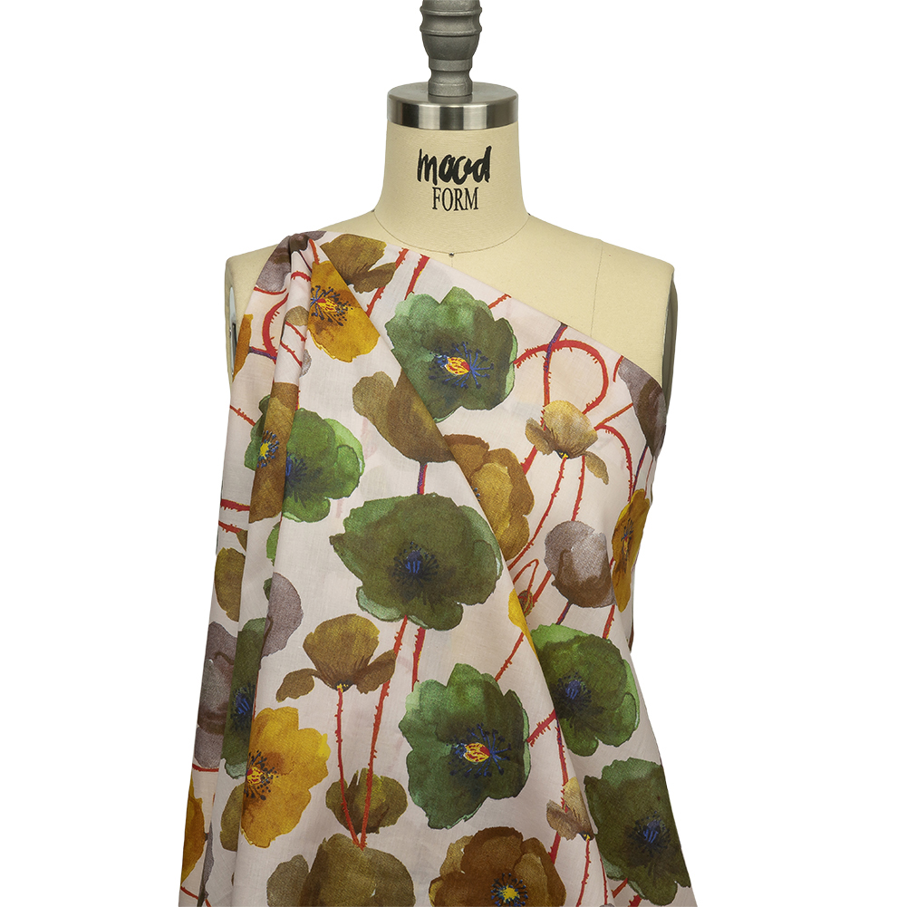 Impress everyone you meet wearing this Lime, Olive and Red Orange Painterly Blooms Cotton Lawn, a truly nature-inspired Monet masterpiece! Here we have an earth-toned garden of blooming peonies in lime and olive green, classic blue, and yellow composed of watercolor brushstrokes, accompanied by muted red-orange stems and tiny thorns over a pink-tinted white base. Perfect for warm seasons, this airy cotton lawn is soft with a flowy drape. Convert this dreamy work of art into short sleeve shirts, sun dresses, full skirts, beach cover-ups, and scarves! Since the textile has a plain weave that is highly translucent, a lining is encouraged for most projects.