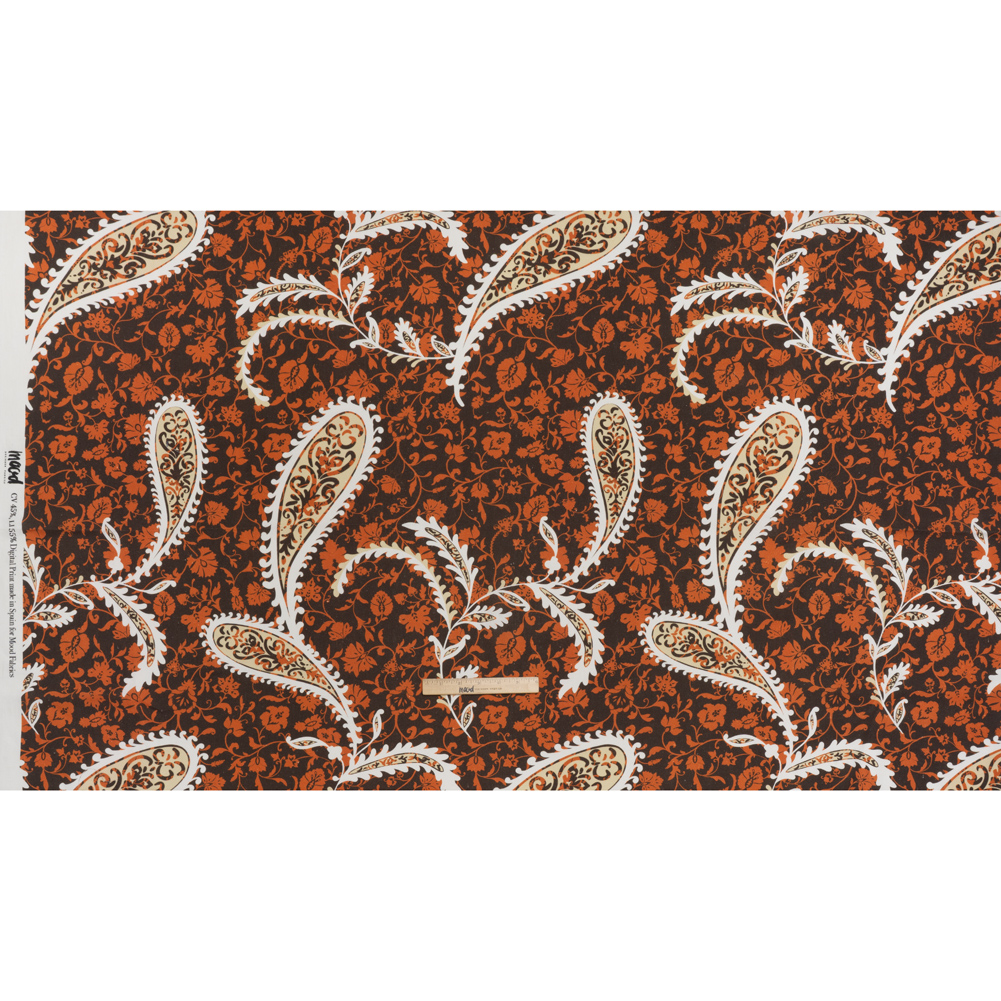 Linen and Rayon Woven - Dark Brown, Pumpkin Orange and White Paisley and Floral Vines - Mood Exclusive Blooming Boogie Print