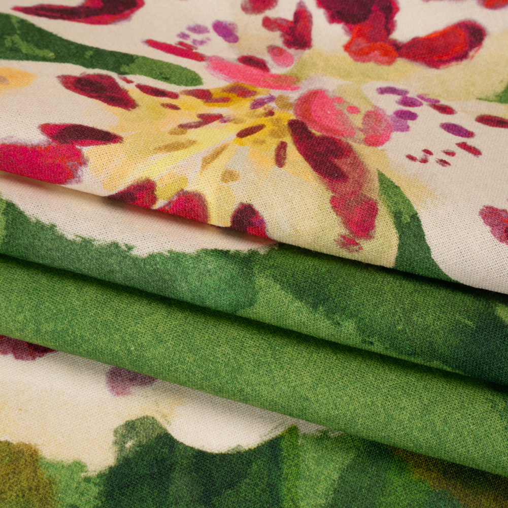 Linen and Rayon Woven - Green, Cream and Magenta Painterly Lilies - Mood Exclusive Petal Poesy Print
