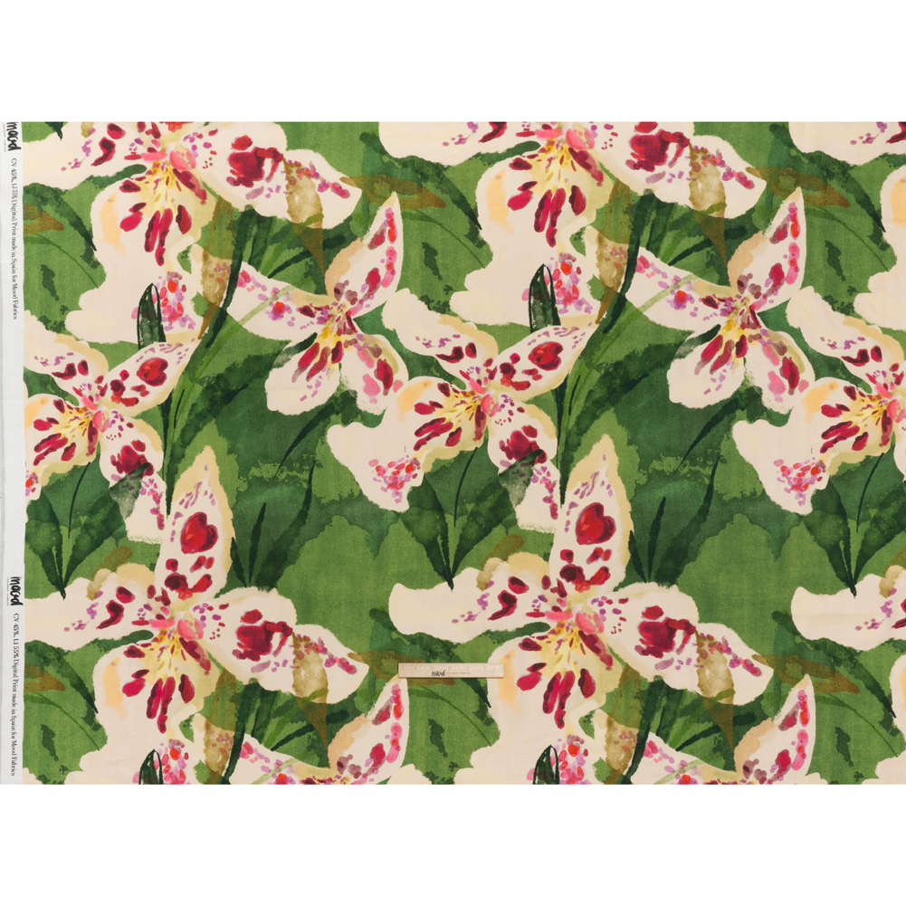 Linen and Rayon Woven – Green, Cream and Magenta Painterly Lilies – Mood Exclusive Petal Poesy Print