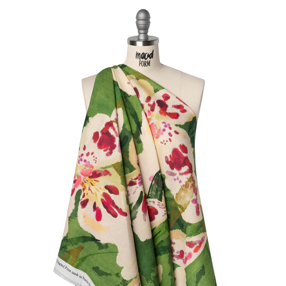 This Mood Exclusive Petal Poesy Linen and Rayon Woven is poetry spun into fashionable form. Lightweight with a slubbed face and a cool, refreshing hand, it's the perfect simple fabric for warm, sun-soaked months.Suggested Projects: Shirts, Jackets, Pants, SkirtsContent: 55% European Linen, 45% ViscoseStretch: NoneOpacity: Slightly TranslucentCream-colored lilies with magenta and purple centers unfurl across a lush green meadow, each bloom painted with a natural, brushstroke-like elegance. This linen and rayon woven is lightweight and supple, featuring a slubbed face and a cool hand. The easy-going feel of linen makes it a perfect summer fabric, quick to become a vacation staple, a workplace go-to, and everything in between. Create relaxed button-downs, long skirts, flowy pants, and more! Slightly translucent, a lining may be added to increase opacity and luxury.