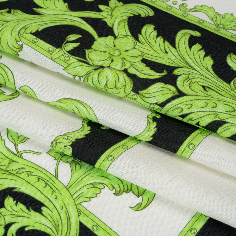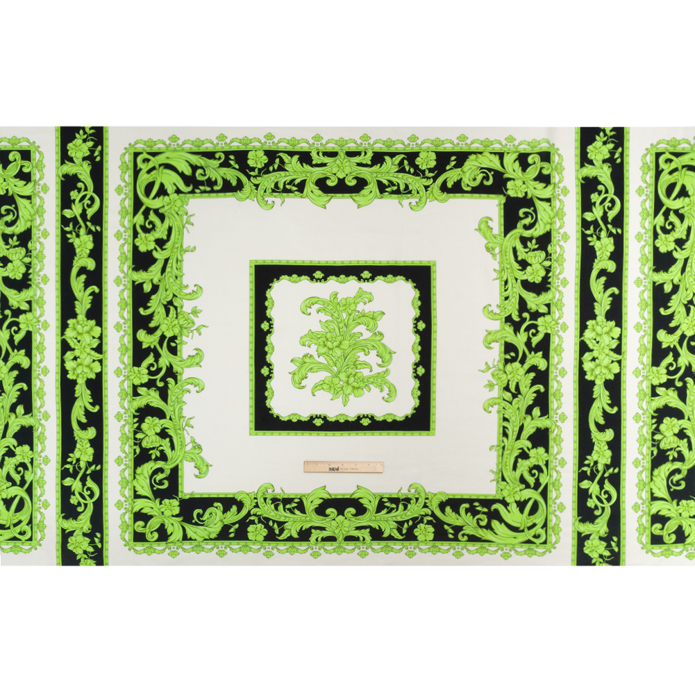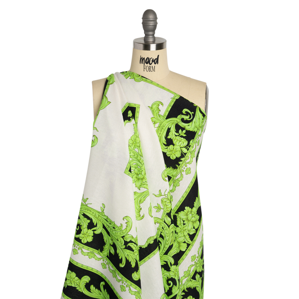 Regal, stately, and bold, our Mood Exclusive Luxurious Stay Linen and Rayon Woven invites your style to have a luxurious stay. Against a white background, black frames are adorned with bright green leaves and flowers. This medium-weight and malleable woven blend boasts a pebbly face and a cool, comfortable hand, making it an ideal choice for warm-weather attire. With its easy-going feel, linen is quick to become a vacation staple, a workplace go-to, and everything in between. Unlock relaxed looks with just a stitch—create button-ups, wide-legged pants, pinafore dresses, and more! Translucent, a lining is recommended for those seeking total opacity. Please Note: This panel measures 53" wide by 33" long.
