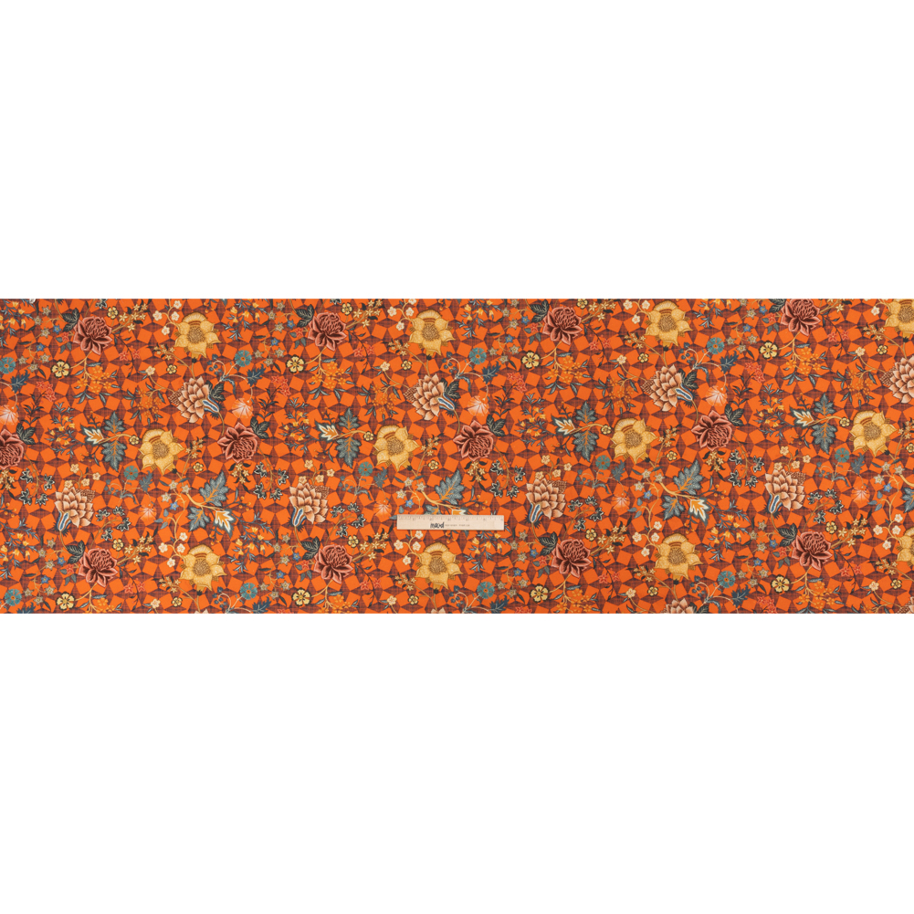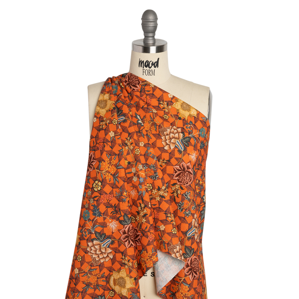 Linen and Rayon Woven Print – Orange and Blue Diamonds and Flowers – Mood Exclusive Rattan Roses