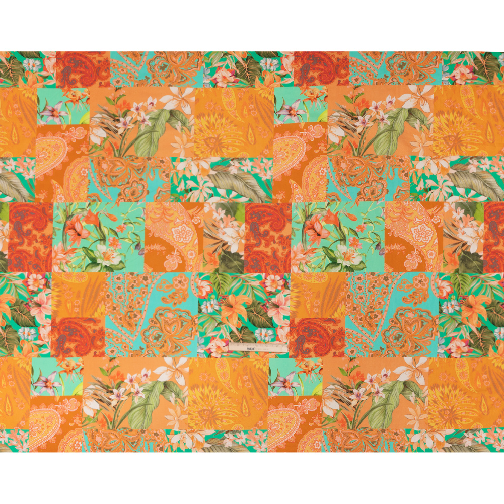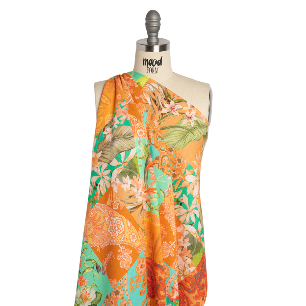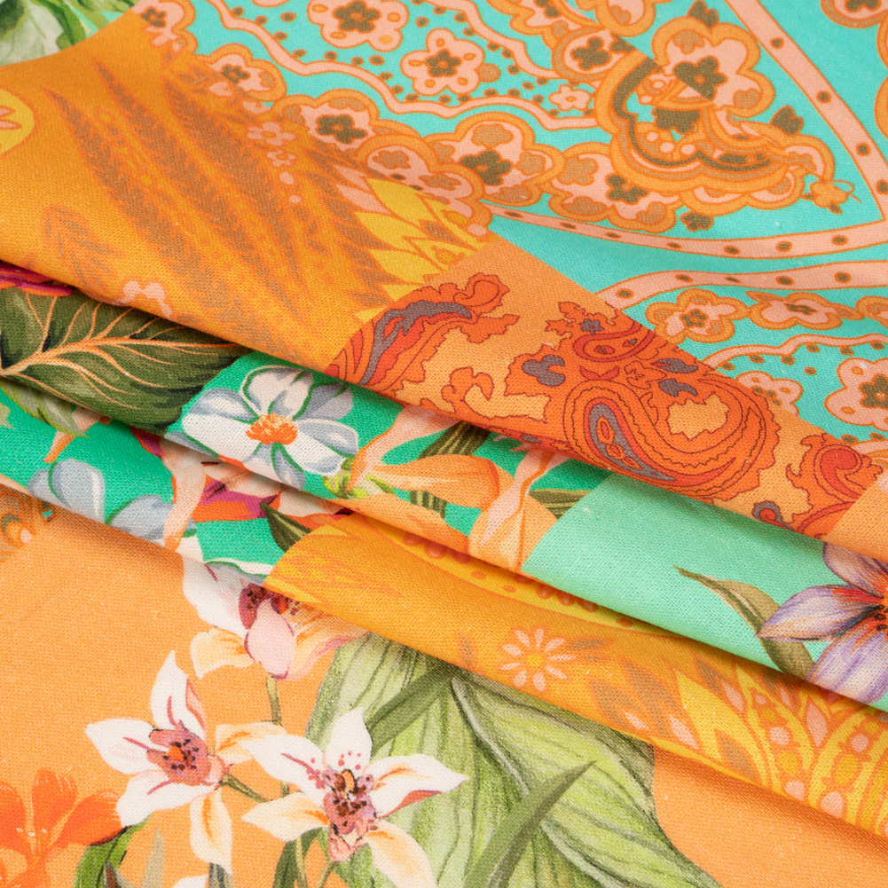 Linen and Rayon Woven Print - Turquoise and Orange Floral and Paisley Patchwork - Mood Exclusive Feel the Power