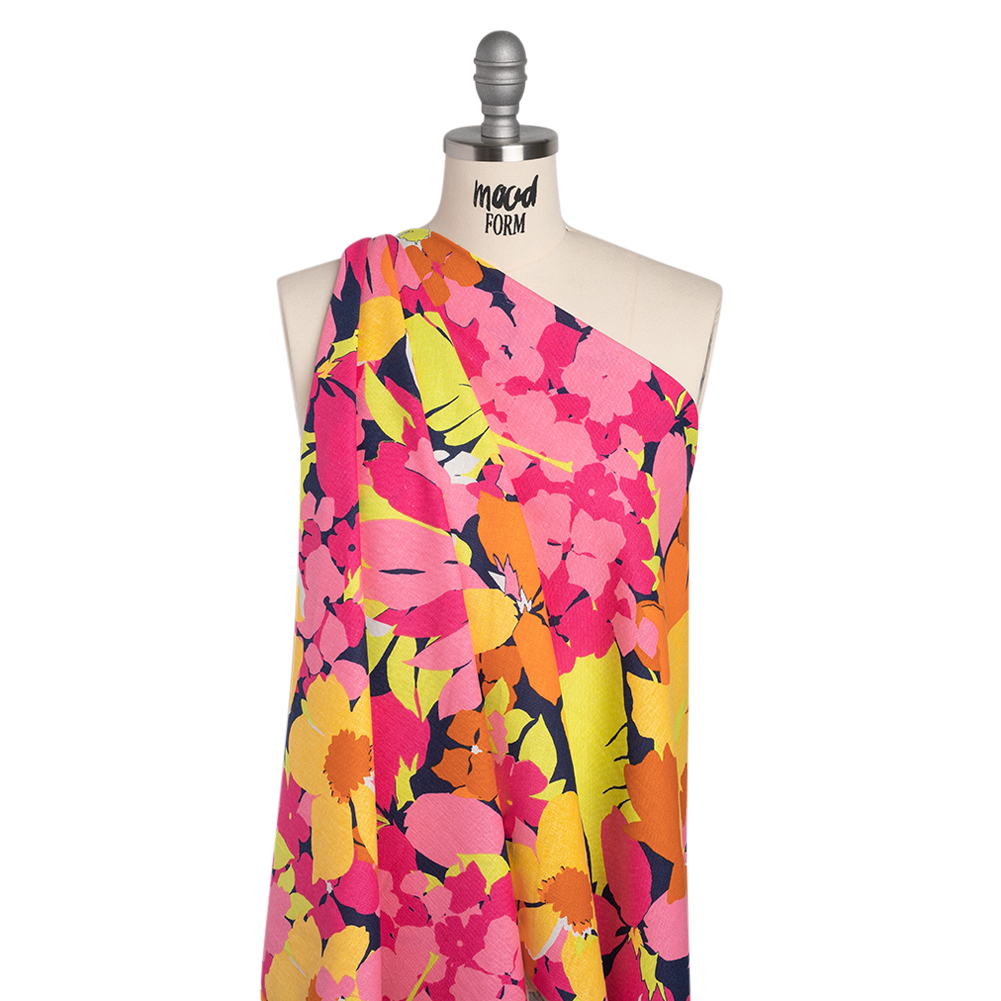 Summer designs easily bloom from this Floral Linen and Rayon Woven Print—featuring a slubbed, cool hand and supple drape, perfect for warm-weather wardrobes.Suggested Projects: Shirts, Jackets, Pants, SkirtsContent: 55% Linen, 45% RayonStretch: NoneOpacity: Slightly TranslucentA lively bouquet of yellow, orange, pink, and green blooms bursts across a navy backdrop, layering petals in a playful tangle. Lightweight and breathable, this linen and rayon woven features a slubbed, cool hand and supple drape—effortlessly embodying the spirit of summer. With a laid-back charm, it’s ready for sun-soaked vacations, breezy office days, and everything in between. Craft relaxed button-downs, sweeping skirts, flowy wide-leg pants, and more!