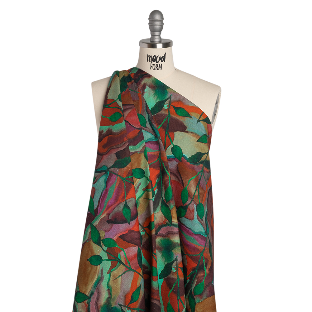 Emerging from the depths of a water-filled landscape, this Mood Exclusive Watercolor Wetland Linen and Rayon Woven captures the essence of ever-moving tides. Lightweight and with a slubbed face and cool hand—thanks to its linen-rayon construction—it’s the perfect simple fabric for the warmer months.Suggested Projects: Shirts, Jackets, Pants, SkirtsContent: 55% Linen, 45% ViscoseStretch: NoneOpacity: Slightly TranslucentRich green stems and leaves stretch upward, flourishing against a mesmerizing watercolor backdrop that swirls with the vivid tones of wine red, mint green, bright red, fuchsia, and brown. Like the vibrant life emerging from the wetlands, these botanical elements rise from the fluid, ever-changing landscape, evoking the movement of water and the lush, growing oasis that surrounds it. This linen and rayon woven is lightweight and supple, featuring a slubbed face and a cool hand. The easy-going feel of linen makes it a perfect summer fabric, quick to become a vacation staple, a workplace go-to, and everything in between. Create relaxed button-downs, long skirts, flowy pants, and more! Slightly translucent, a lining may be added to increase opacity and luxury.