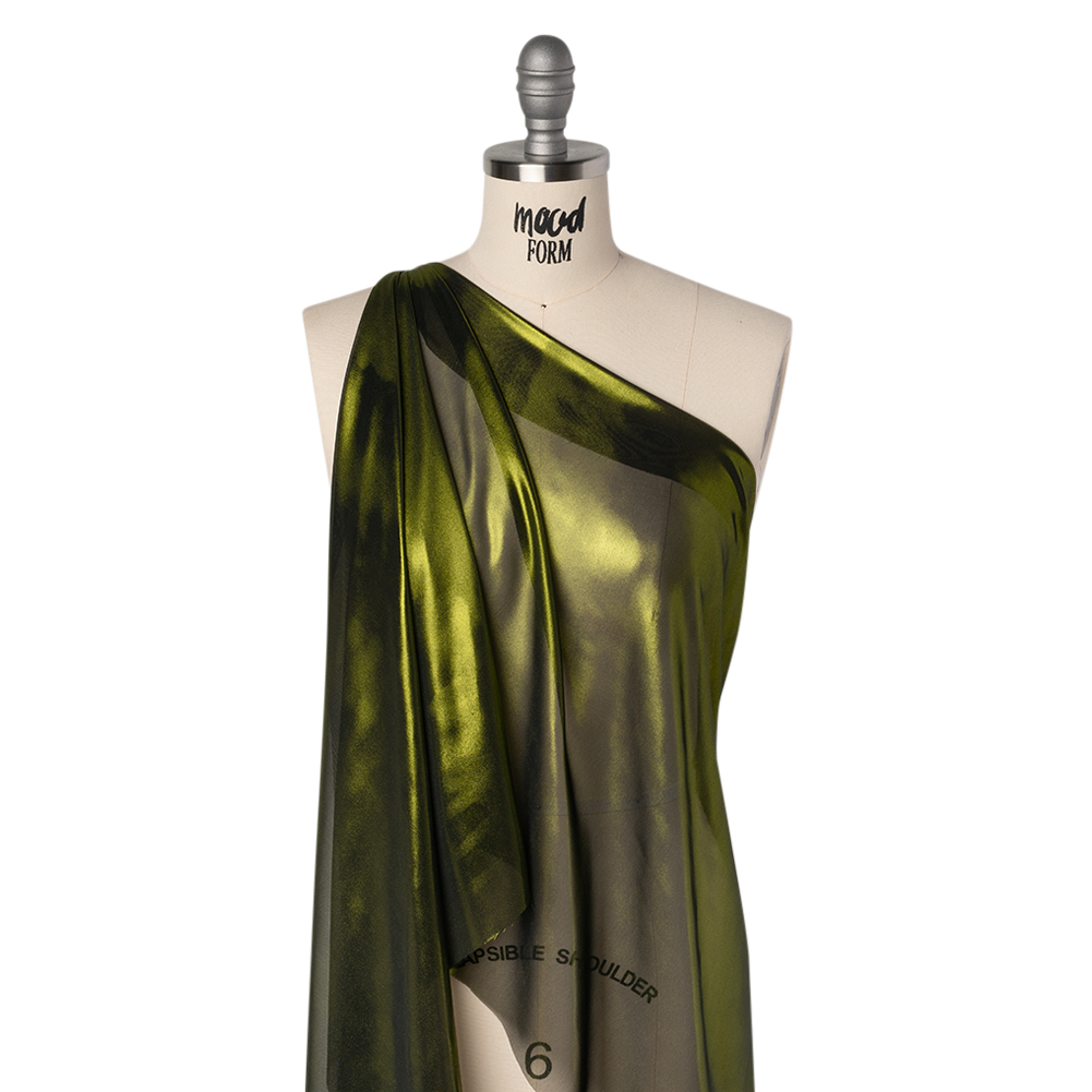 Liquid Sheen Metallic Polyester Chiffon - Olive on Black - Liquid Sheen Chiffon Collection