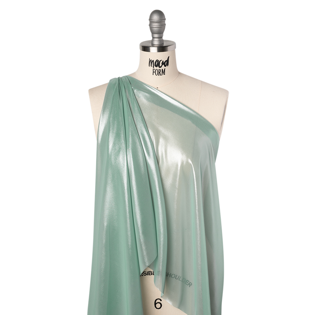 Spend your summer chasing fairies through the forest in this Silver on Aqua Liquid Sheen Metallic Polyester Chiffon—featuring a dry, grainy hand and fluid drape.Suggested Projects: Dresses, Skirts, Shirts, BlousesContent: 100% PolyesterStretch: NoneOpacity: SheerA silver metallic sheen shimmers like moonlight and pixie dust atop this aqua green chiffon, casting an enchantment over its airy weave. Light as a whisper with a fluid, graceful drape, it’s destined for gowns that glide like mist, floaty summer dresses that catch every breeze, airy scarves, and delicate blouses worthy of a fairytale dawn. Sheer and ethereal, consider adding a lining if your design calls for added opacity or shape as you bring your magical vision to life.