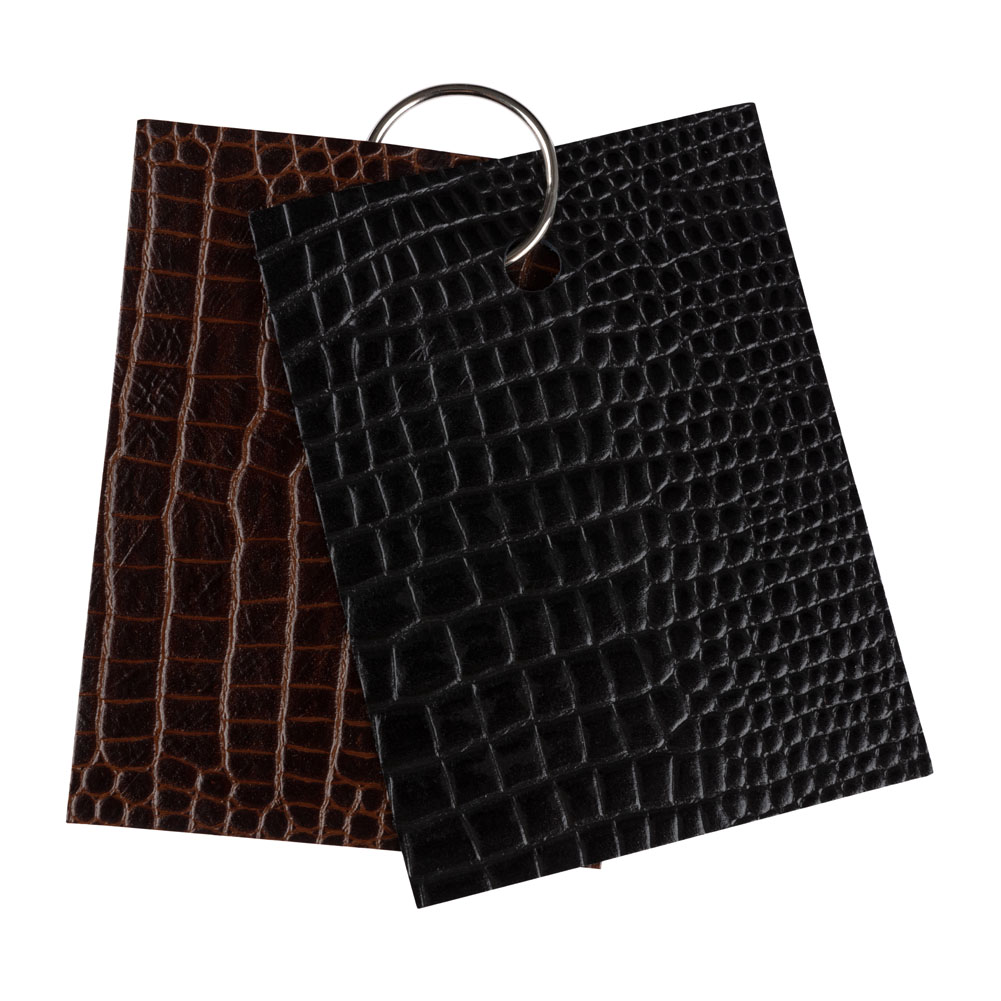 Exotic and edgy, this Lorraine Italian Black Semi-Aniline Alligator Embossed Top Grain Cow Leather Hide is a luxurious way to let your creativity shine through your home decor. Tanned and finished by hand in Italy, this rich black leather features a subtle multi-tonal effect and textural embossed alligator pattern. A natural paraffin finish lends exceptional luster and higher durability, making this leather suitable for projects meant to last a lifetime. Tactile and soft in hand but with a stiffer drape, use it for upholstering dining room chairs, bar stools, love seats, or ottomans. Bags, from oversized totes to glam clutches, will also shine in this unique leather.Please Note: Due to the handcrafted nature of this leather, the colors and patterns will vary from hide to hide.The color fastness to rubbing of this leather is 500 Cycles Dry, ≥ 4 and 250 Cycles Wet, ≥ 3.5. This leather is compliant with California TB 117-2013.