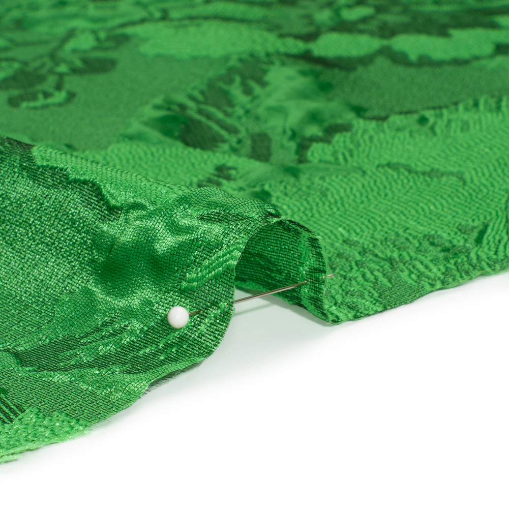 Enjoy the explosion of florals on this Luminous Green Floral Lightweight Luxury Brocade. The complex weave of this brocade gives the green flowers an embroidered-like look as well as raises petals from the surface. To deepen the dimension of the face, darker maroon hides in the corners of the blossoms. The hand switches from sleek to grainy and the drape is voluminous, inspiring luxurious formal garments of all styles and silhouettes. Invite this lustrous fabric to special occasions as a long gown, circle skirt, structured jacket, exciting corset, and more! As this fabric is highly transparent, a silk habotai lining is recommended to increase opacity and luxury!