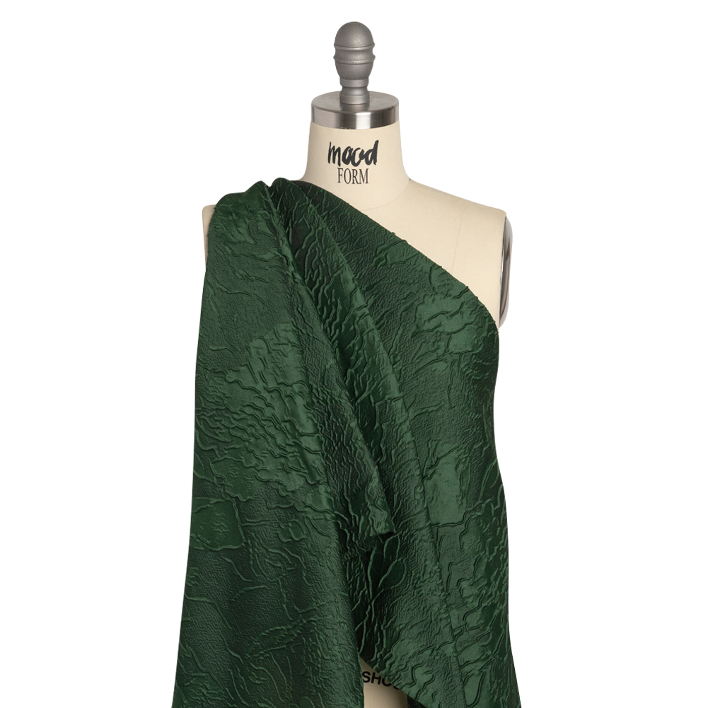 This Luminous Hunter Green Crinkled Luxury Brocade holds a forest of luxe possibilities! Achieved by additional weft threads in the weave, stiff wrinkles form abstract flowers on the lustrous green face, creating a three-dimensional surface teeming with texture.