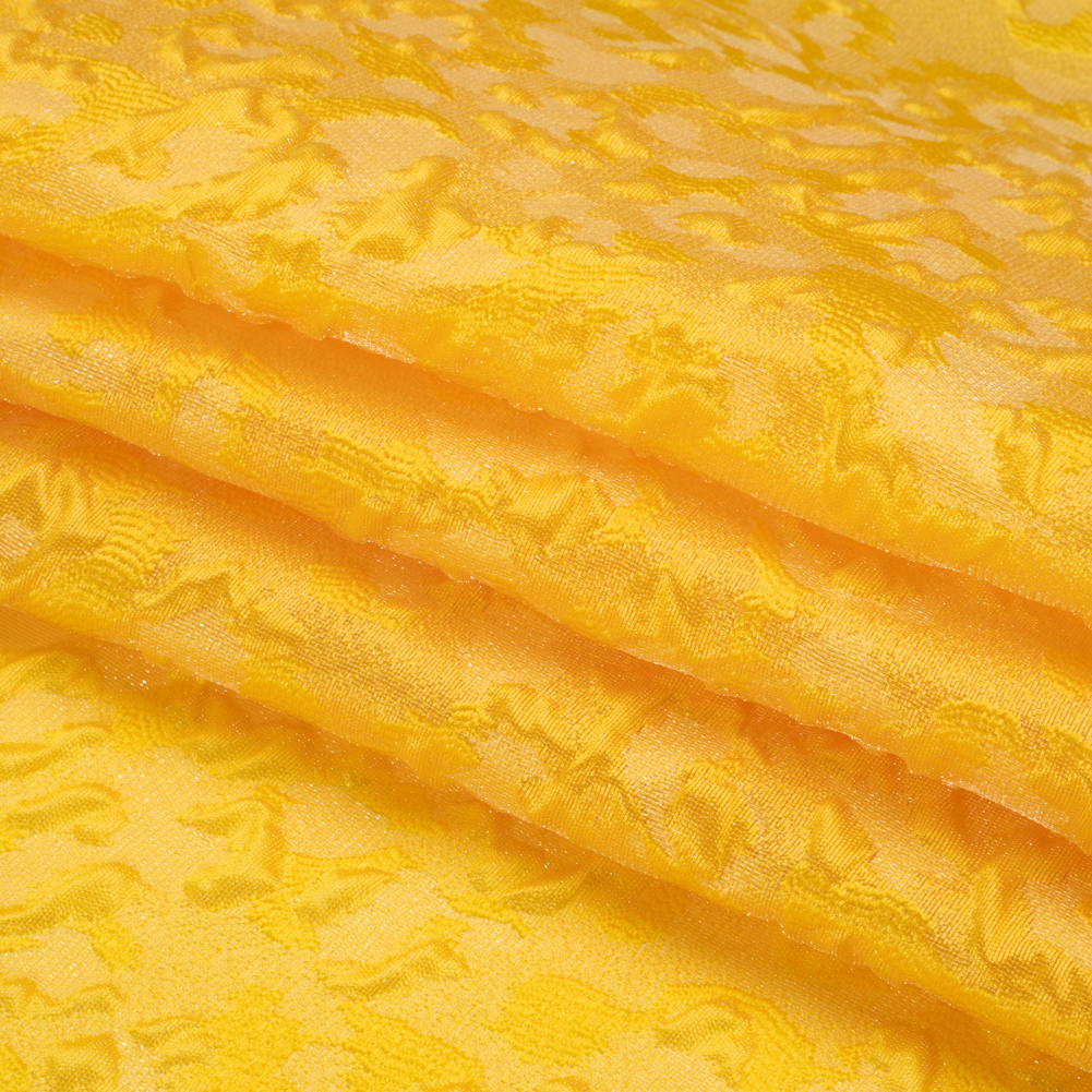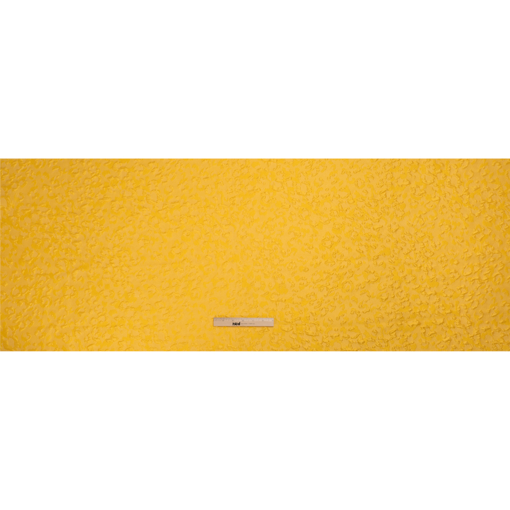 Bring the sunshine to your next event with this Luminous Sunshine Wild Spots Lightweight Luxury Brocade! Bright yellow animal print covers the face of this brocade, with some spots rising from the surface and others highlighted with metallic silver threading. The hand is cool and grainy and the drape is semi-structured yet voluminous. Take this lustrous fabric to special occasions and formal events as a long gown, circle skirt, structured jacket, exciting corset, and more! As this fabric is highly transparent, a silk habotai lining is recommended to increase opacity and luxury!