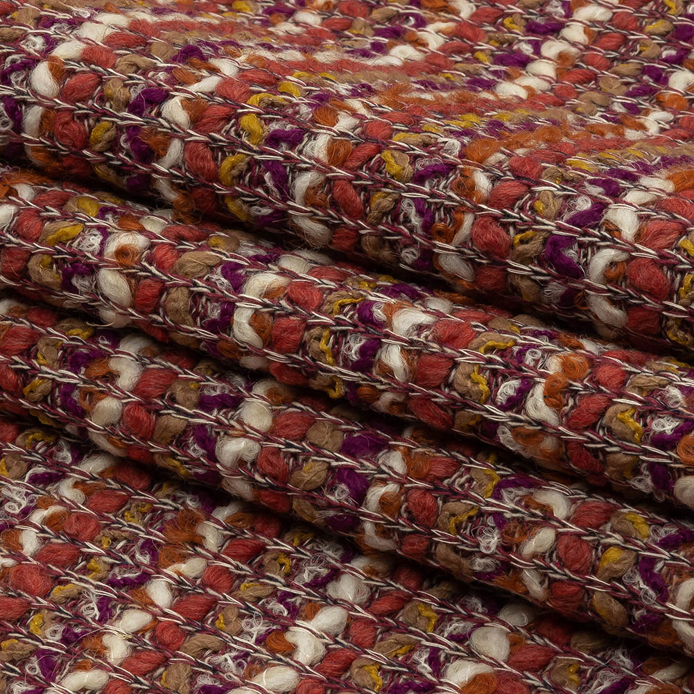 Warm colors, meet warm and cozy with this Magenta, Desert Rose, and White Boucle Stripes Chunky Wool Blend Sweater Knit . Boucle stripes of magenta, desert rose, and white are etched into a magenta-pink base, forming a crisp, textured feel and accented by a malleable drape. Design pullovers, cardigans, ponchos, cropped sweaters, and coats are all made simple with a one-way weftwise of 25%. While opaque, a lining can be used for more comfort and stability if desired.