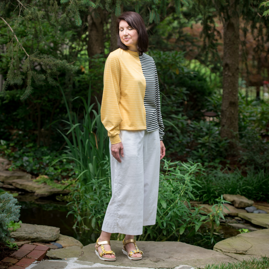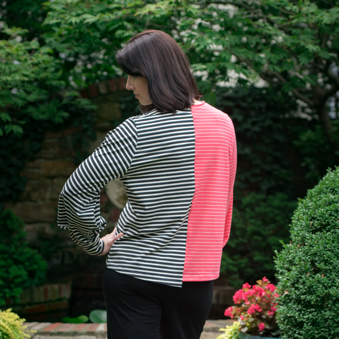 Marceau Tee Loose-fitting, hip-length top with shifted right and left sides, ready-to-wear neck binding, two-piece sleeves with cuffs and pleated detail on upper sleeve.