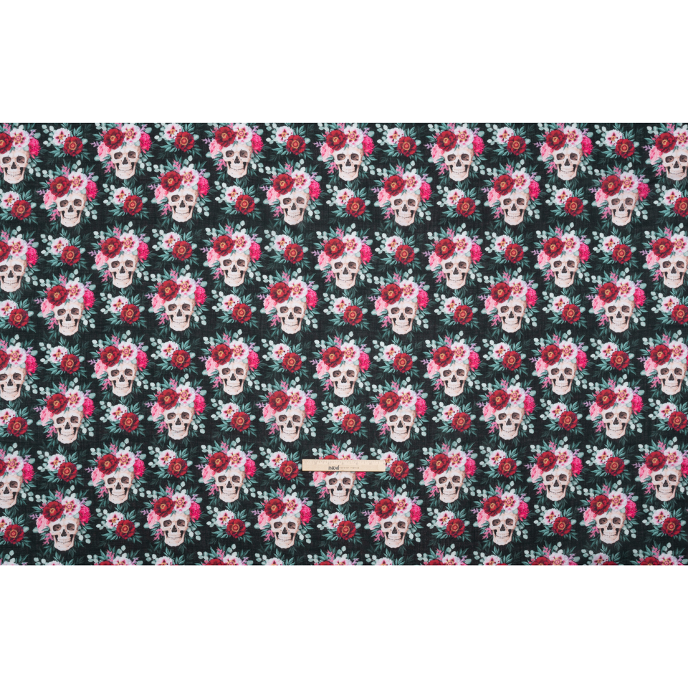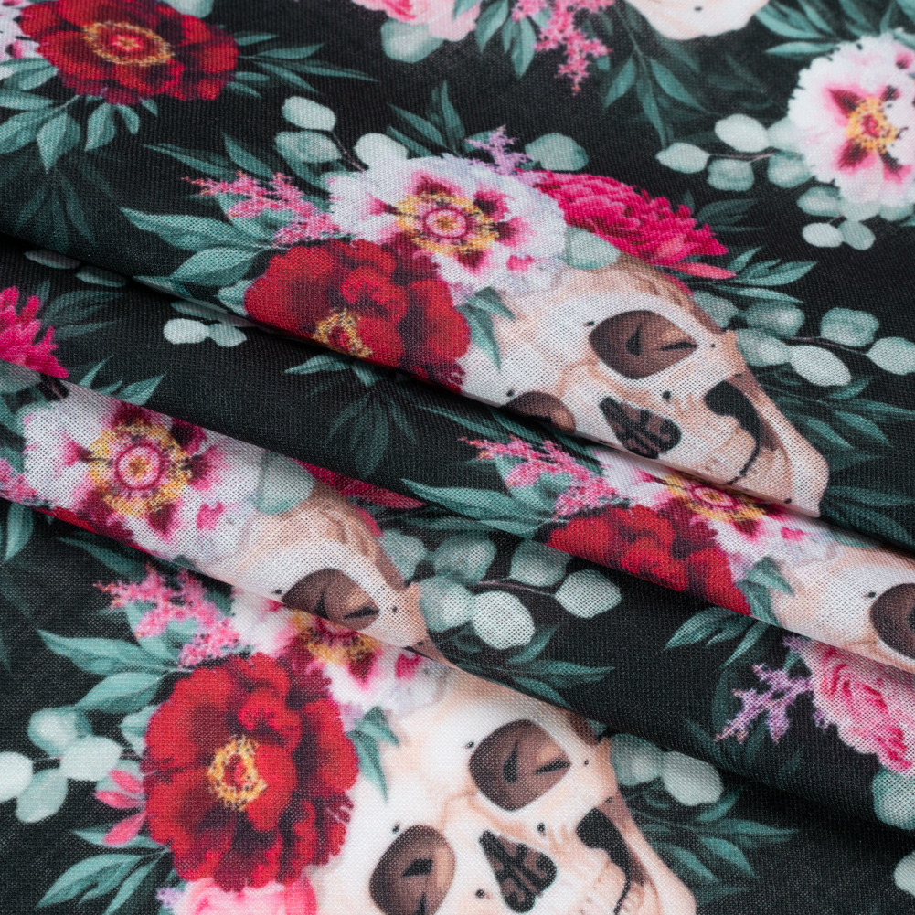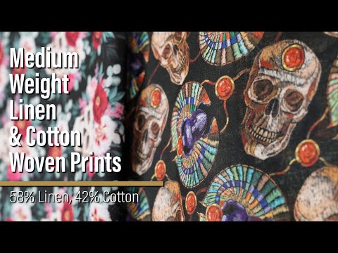 Get ready for Cinco de Mayo with this Flower Skulls Linen and Cotton Woven. Medium in weight, it features a soft, smooth hand and fluid drape that perfectly lends itself to breezy warm-weather garments.Suggested Projects: Shirts, Skirts, Dresses, PantsContent: 58% Linen, 42% CottonStretch: NoneOpacity: SheerPale ivory skulls wear a crown of pink and red flowers, adorned with spruce-green leaves atop a black ground. This woven boasts a fluid drape and a soft, smooth hand—with a slight natural texture thanks to its linen content. Use this medium-weight fabric to craft breezy button-ups, flowing wrap-skirts, baggy dresses, wide-leg pants, and more! Sheer, a lining may be used if opacity is desired.