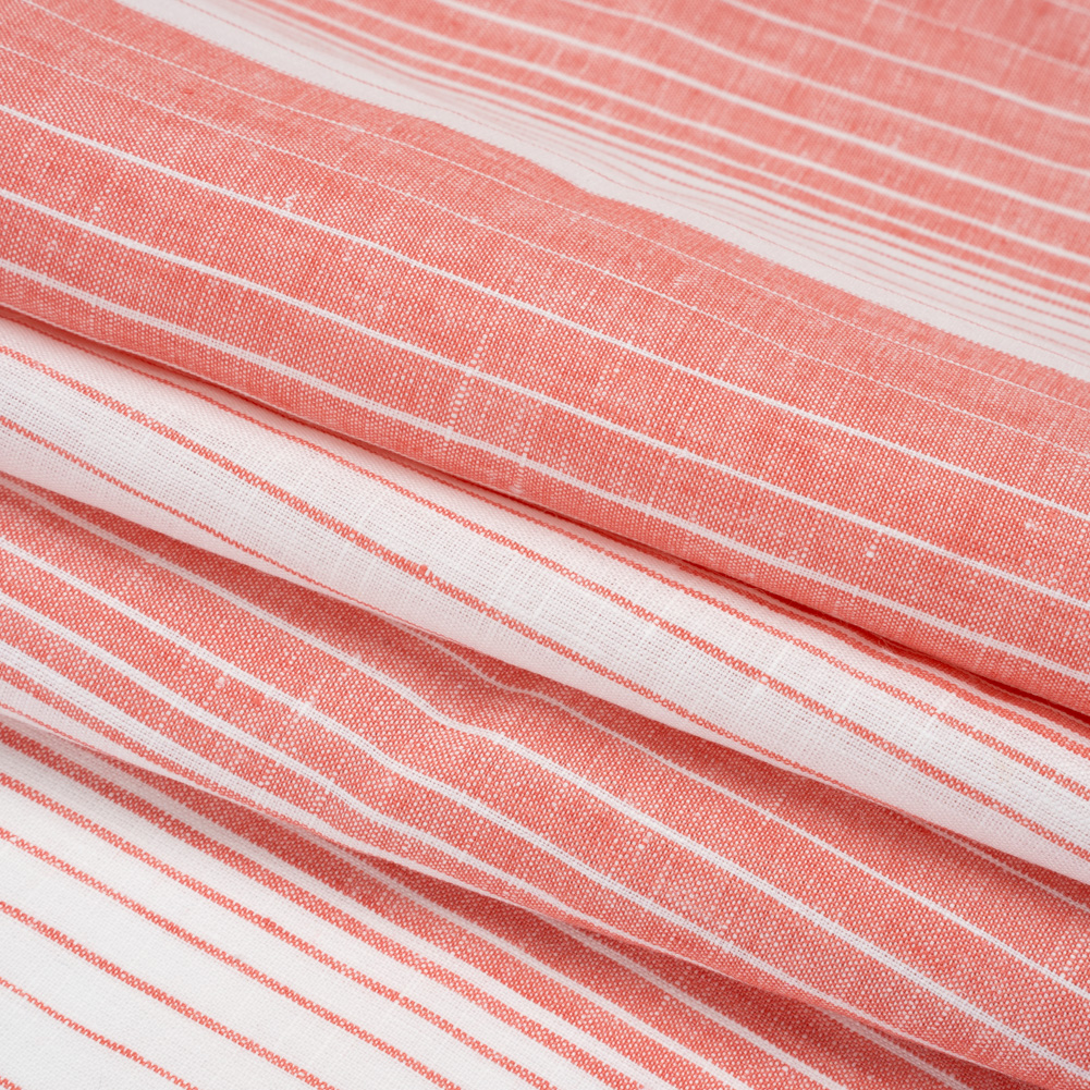 Seaside vacations dream of this Coral Pink and White Gradient Stripes Linen Woven, featuring a medium weight, slightly slubbed, cool hand and crisp drape.Suggested Projects: Shirts, Skirts, Pants, DressesContent: 100% LinenStretch: NoneOpacity: Slightly TranslucentCoral pink and white stripes make their way down in a gradient of thick to thin, complementing the easy-going feel of linen, a warm-weather fabric that will become a vacation staple, workplace go-to, and everything in between. The face is slightly slubbed and the drape is crisp. Naturally moisture-wicking and of medium weight, this linen will make steamy summer days a breeze. Create relaxed button-downs, long skirts, flowy pants, and more! As it is slightly translucent, a lining may be desired depending on the project.